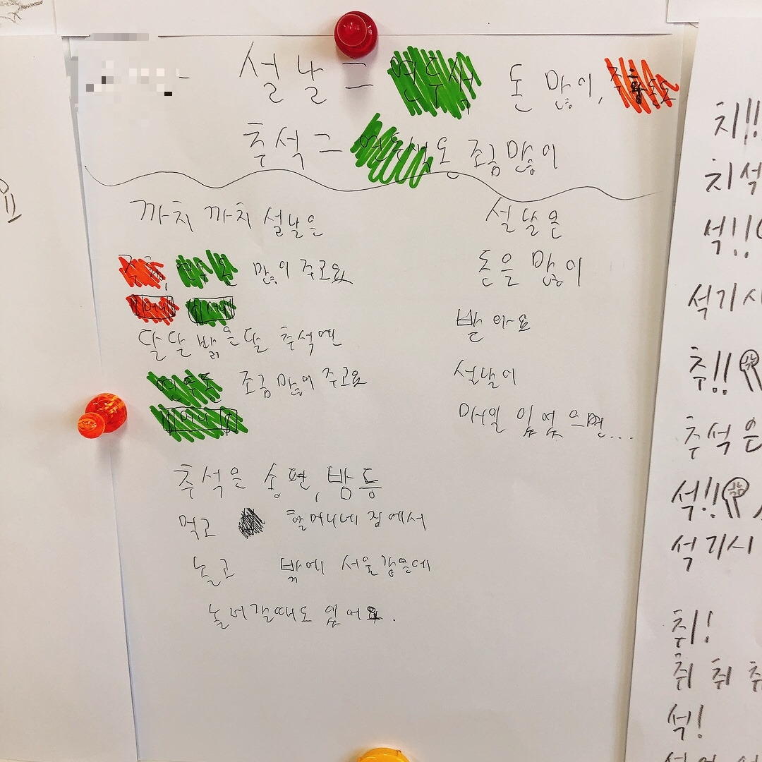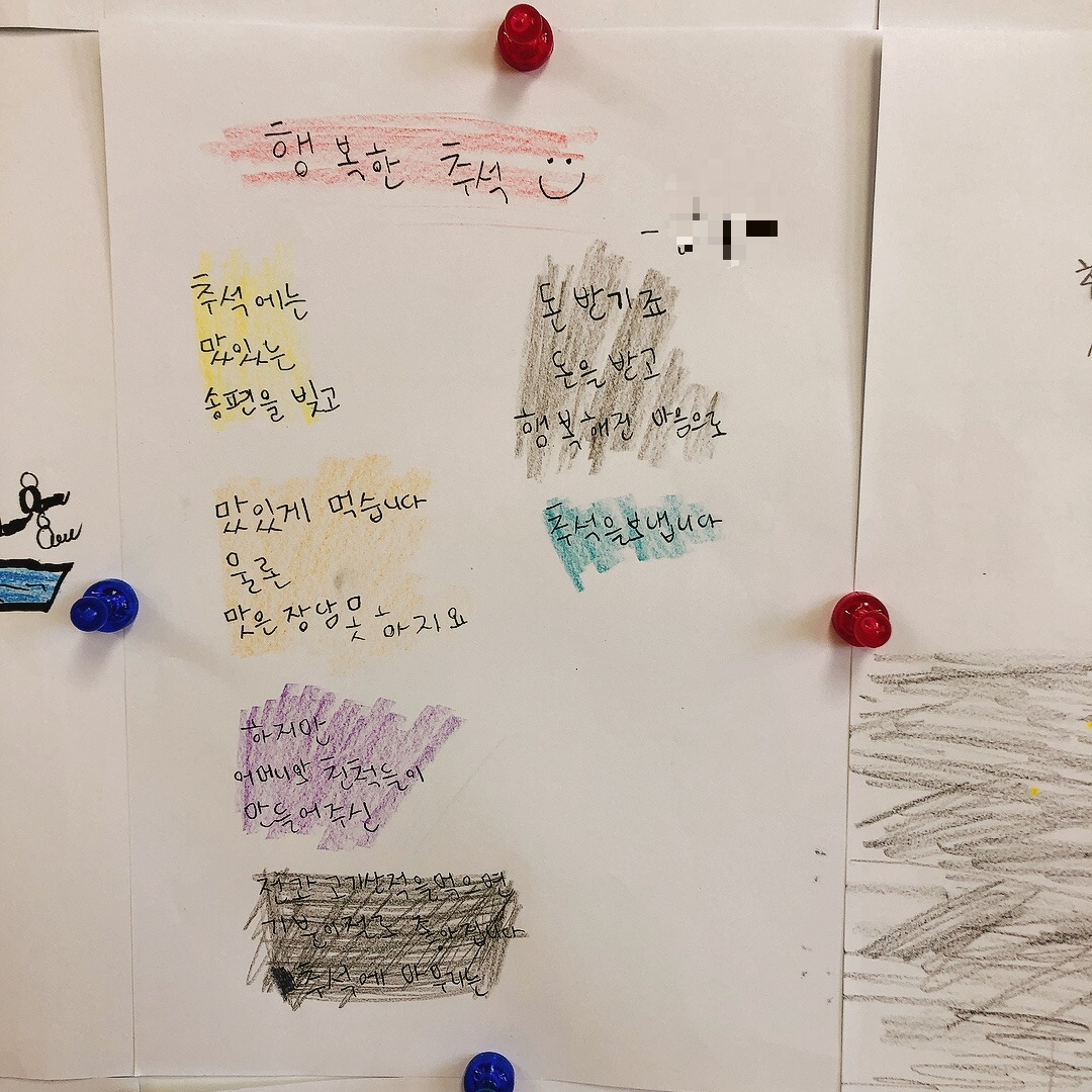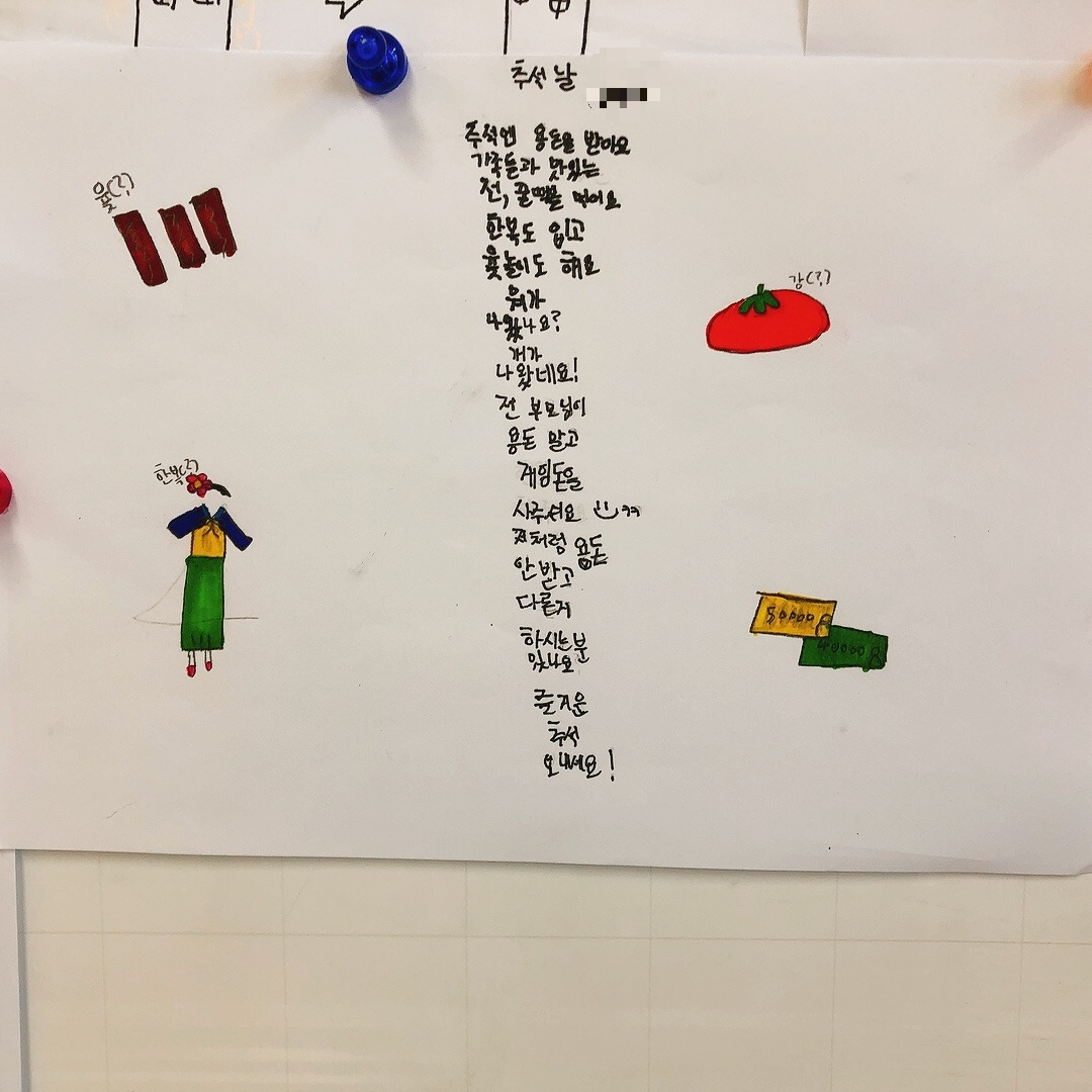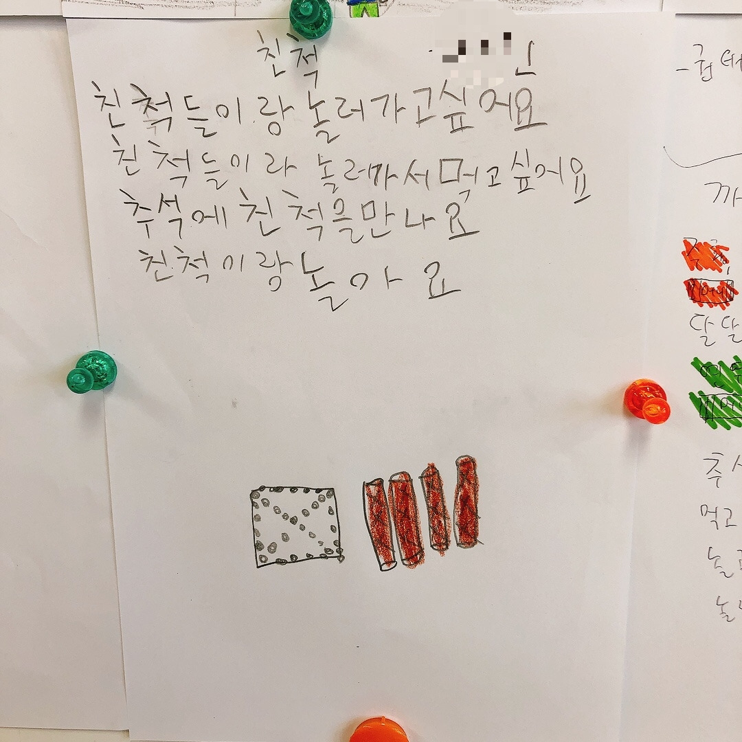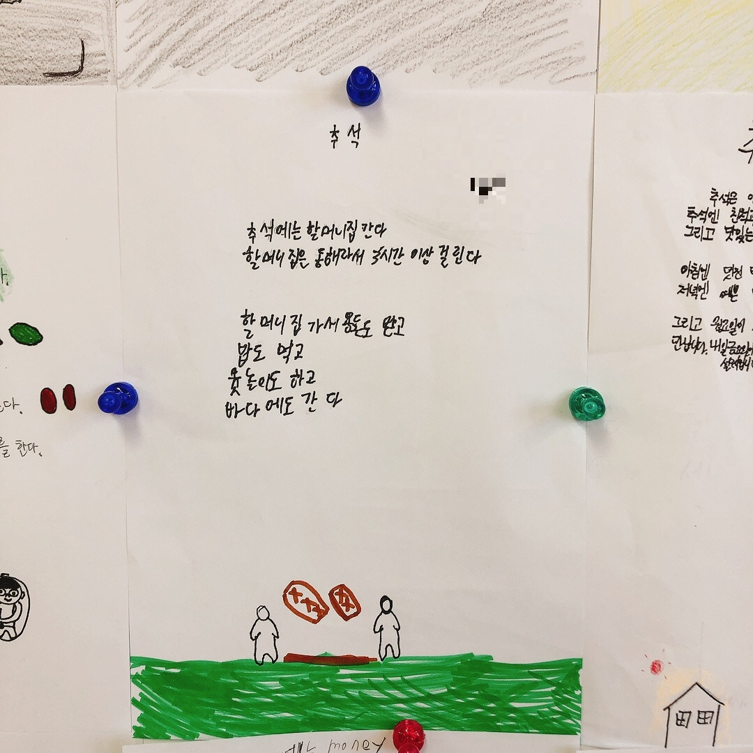 네 번째 시는 ‘추석’에 대한 시였다. 금요일부터 시작되는 추석 연휴를 하루 앞둔 목요일, 추석에 대해 표현해보는 시간을 가졌다. 추석 하면 떠오르는 것들로 추석에 대한 시를 써 예시로 보여주었다. 아이들은 시를 읽으며 왜 밤이 뾰족뾰족해요? 선생님도 매일 추석이었으면 좋겠어요? 물었다. 처음에 밤은 어디에 싸여있지? 묻고 밤송이의 뾰족뾰족한 가시들을 생각했다고 답하며 너희들은 추석 하면 뭐가 떠올라? 추석을 앞두고 기분이 어때? 물었다. 모두 내일부터 추석 연휴가 시작되어 좋다고 하였다. 설레고 기대된다니 내 모습이었다. 어렸을 때부터 추석은 항상 기대되는 명절이었다. 일 년 중 손에 꼽히는 큰 행사이자 중요한 날이었다.