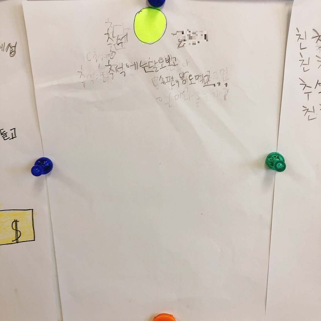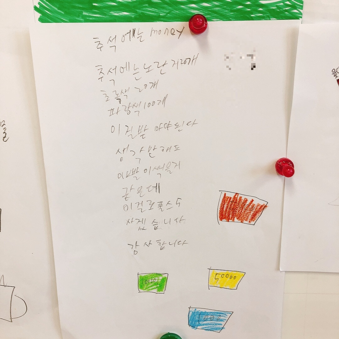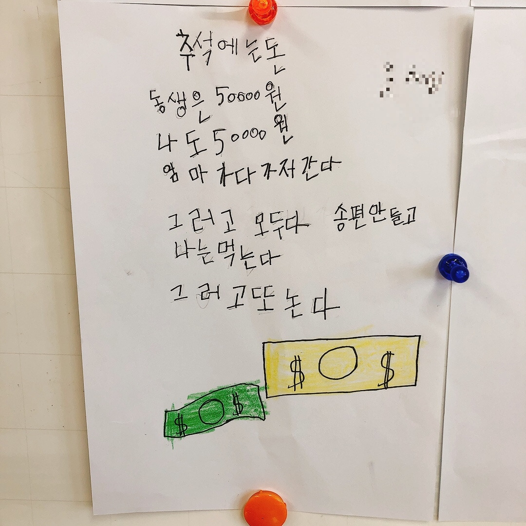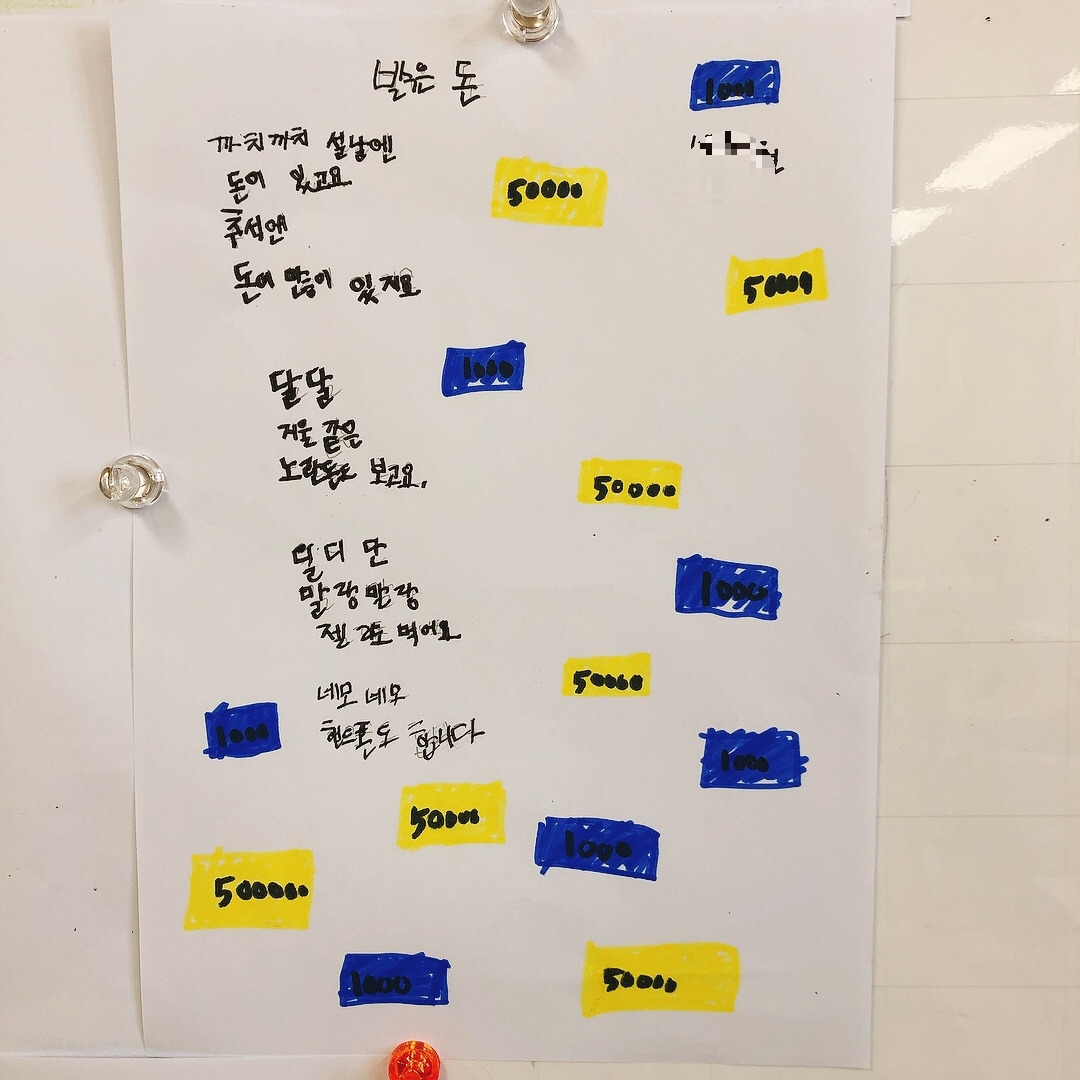 용돈에 관한 이야기도 많았는데 용돈을 받는 것을 매우 좋아했지만 다들 돈이 생기면 그 돈은 엄마한테로 간다며 아쉬워했다. 이건 예나 지금이나 똑같은가 보다. 아이들의 웃기지만 슬픈 고민에 나도 모르게 마스크 속에서 피식 웃음이 새어 나왔다.