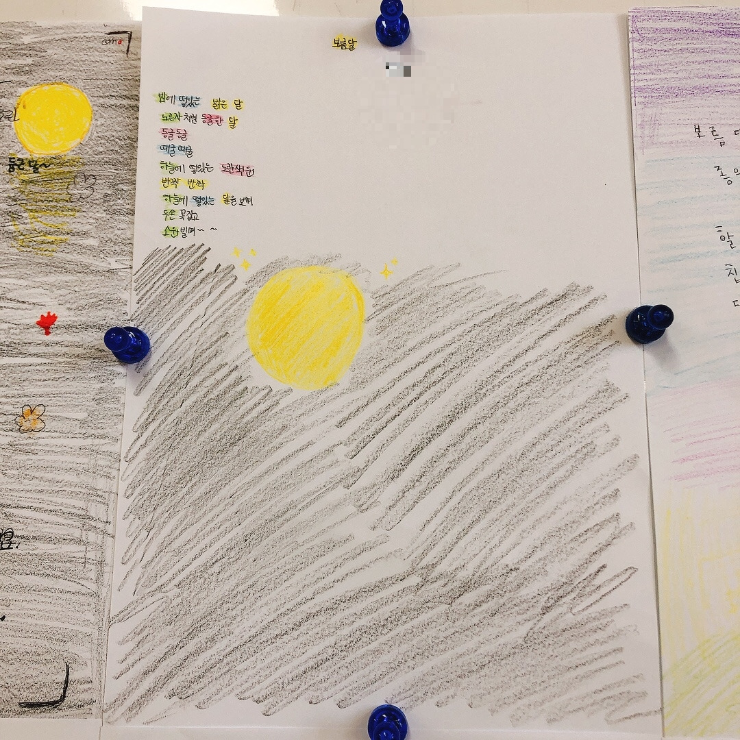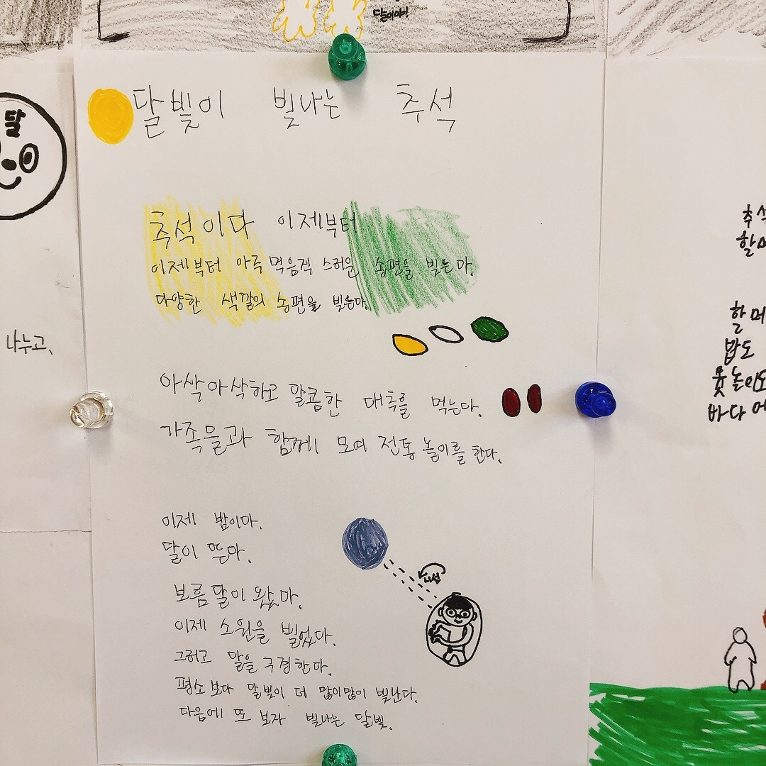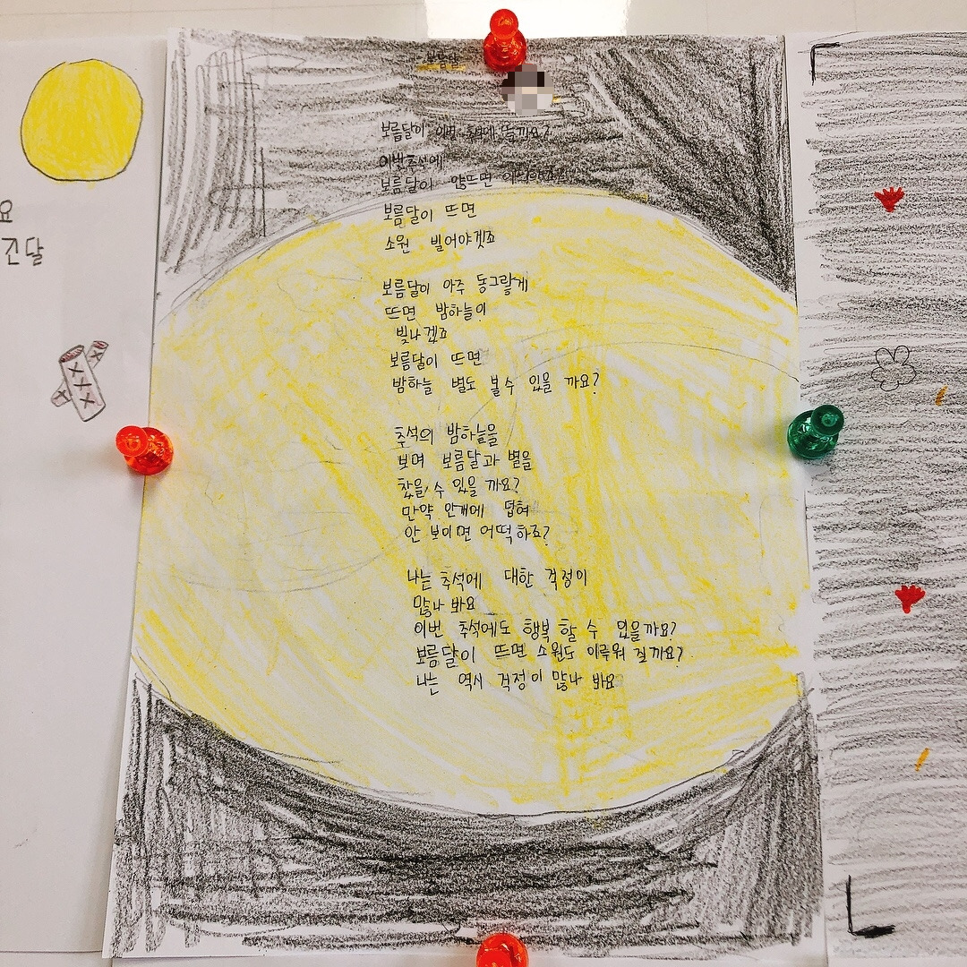 추석이 계속됐으면 좋겠다는 이유가 추석에 볼 수 있는 둥근 달 때문이라는 아이의 시에는 어두운 밤 밝게 뜬 보름달이 예쁘게 그려져 있었다. 다른 아이의 ‘아침엔 멋진 태양이 뜨고 저녁엔 예쁜 달이 뜬다’는 표현도 멋졌다.