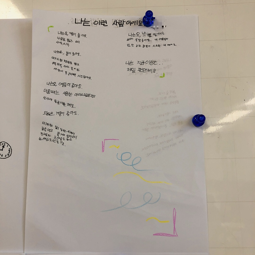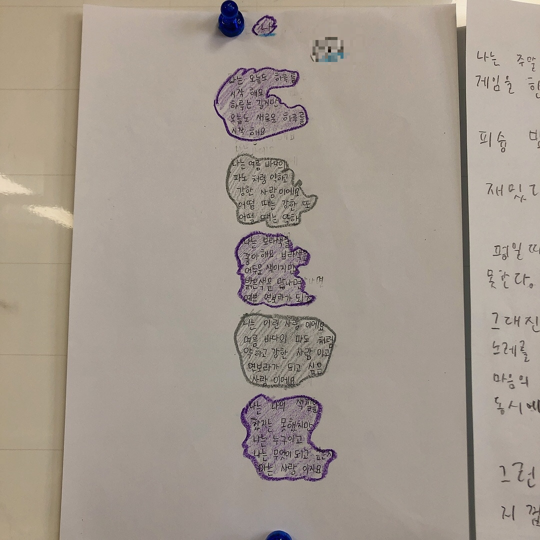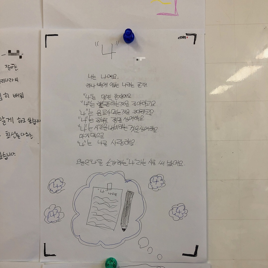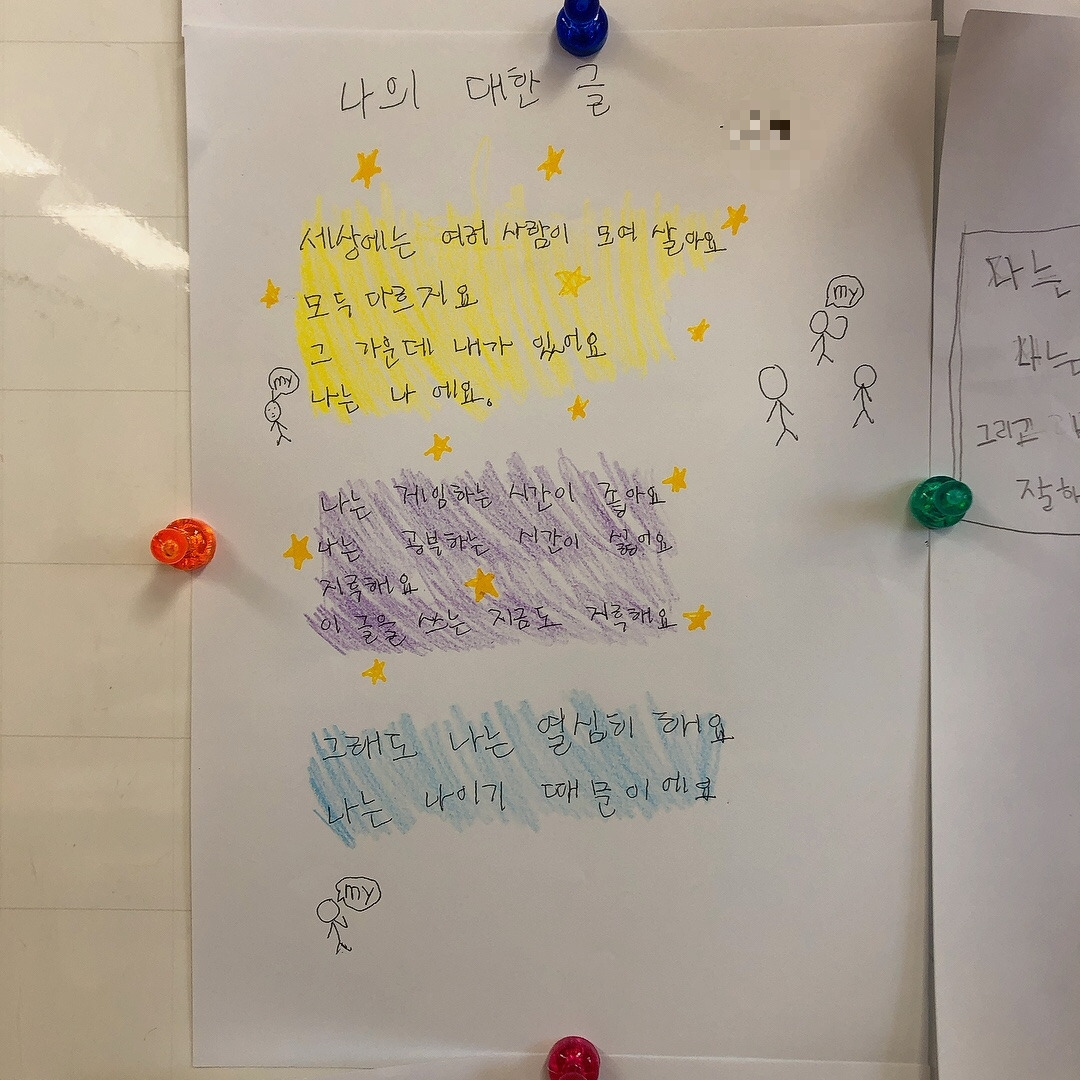 대화를 하며 아이가 자신에 대한 시를 쓰는데 필요한 여러 소재들을 떠올릴 수 있도록 도왔다. 그럼 대부분 자기가 좋아하는 것을 곧잘 찾아 “아! 그럼 저는 이렇게 써볼래요”라고 하며 시작했다. 중간중간 표현하고 싶은 말이 있는데 떠오르지 않으면 나를 찾아와 물어보고 다시 쓰기도 했다.