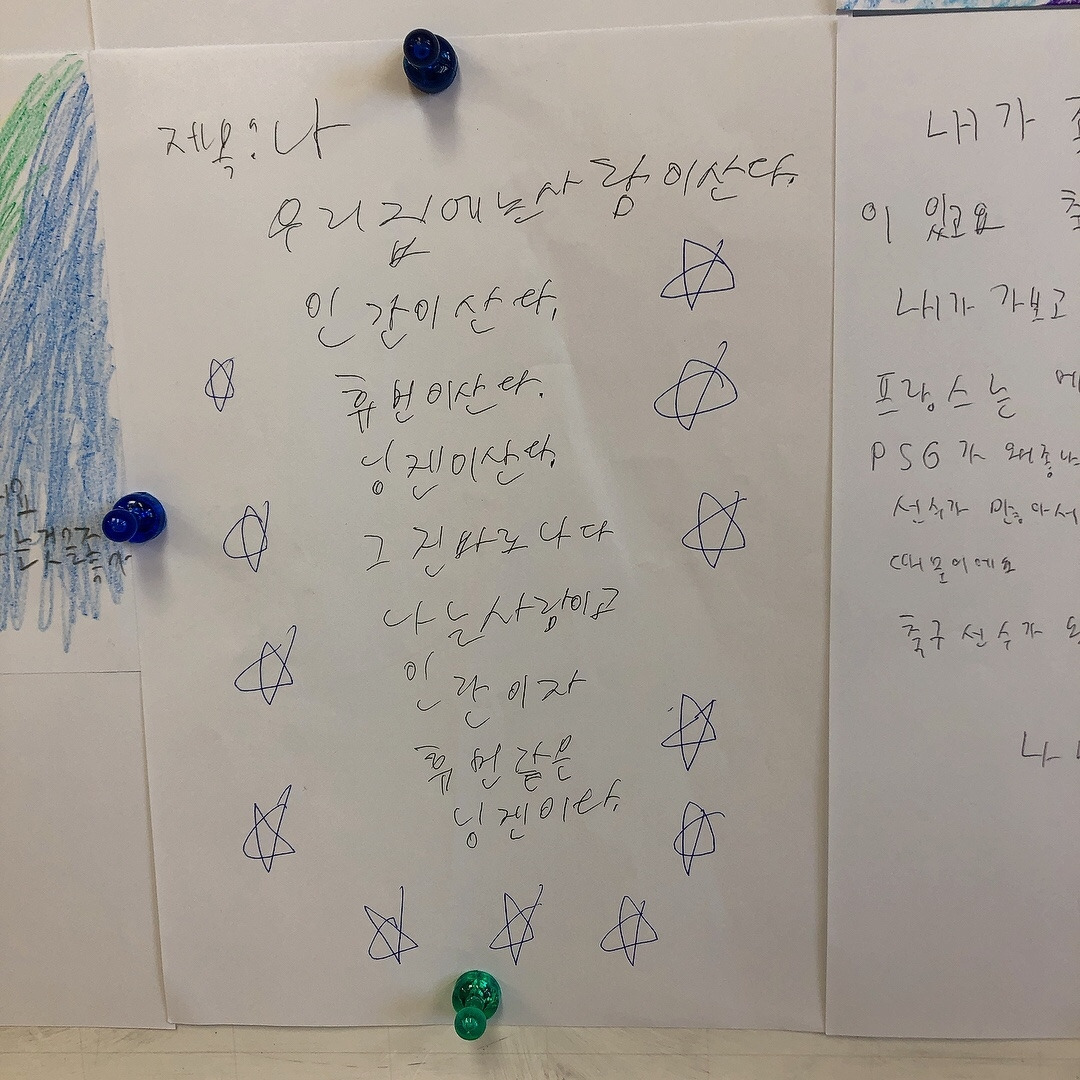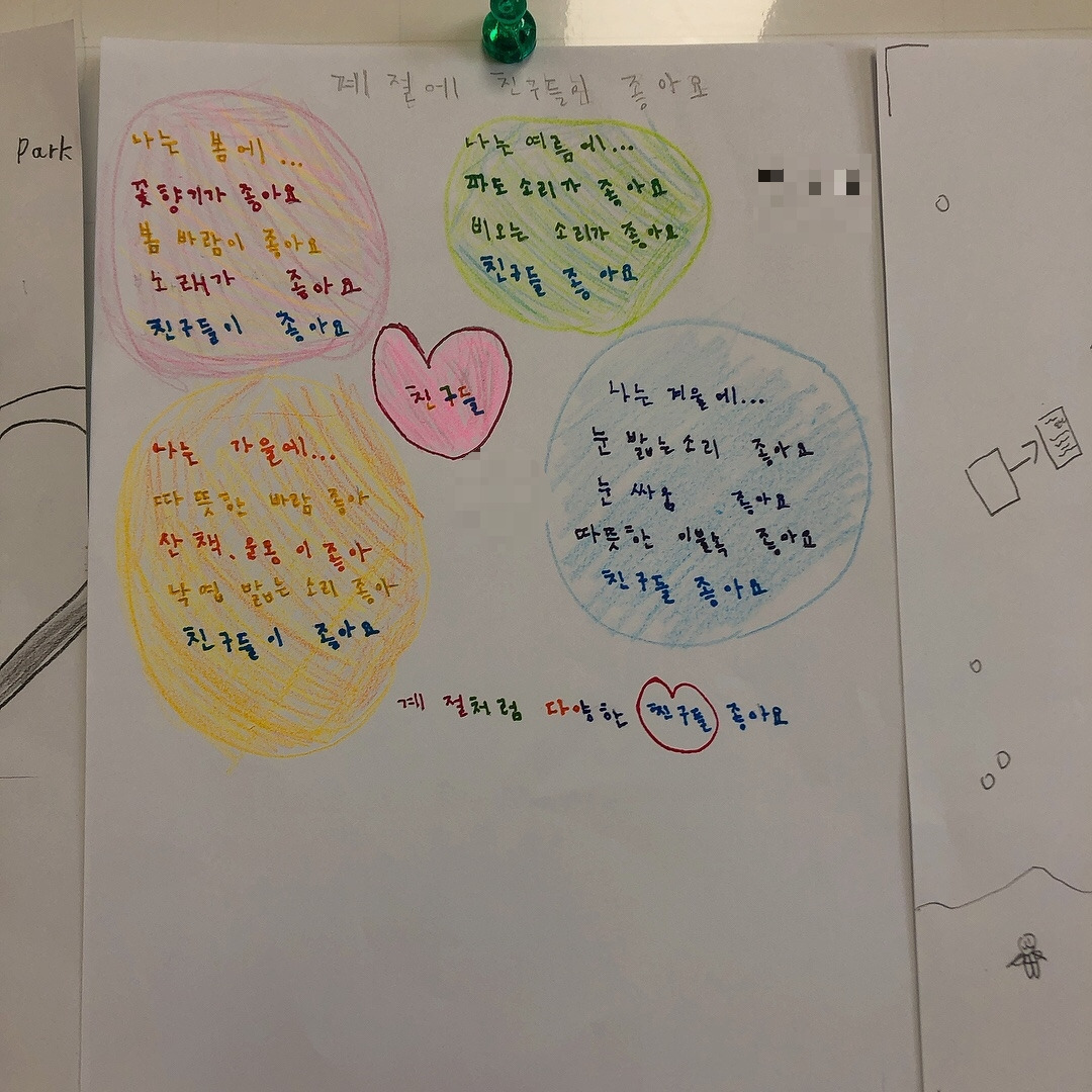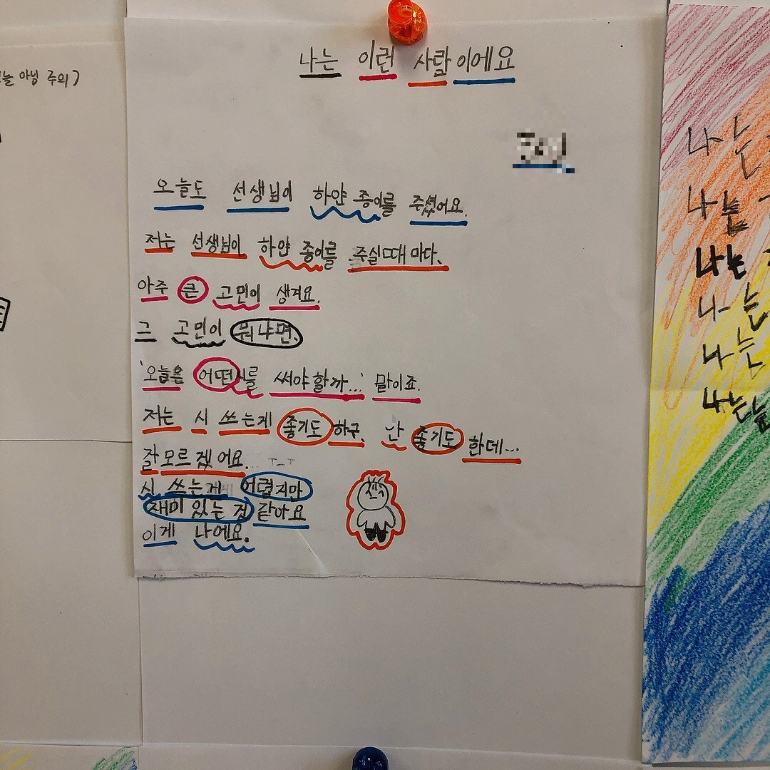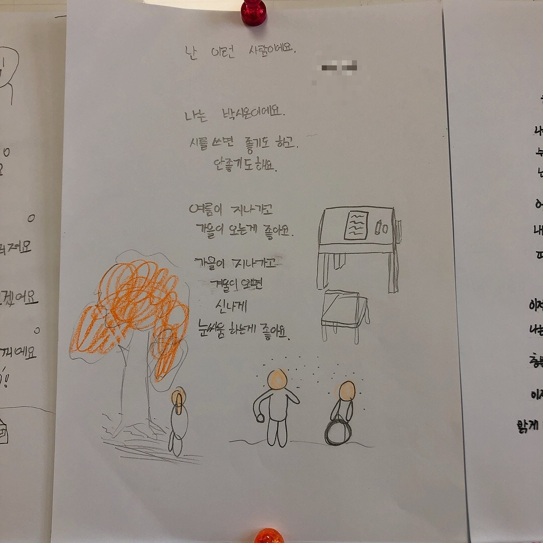 대화를 하며 아이가 자신에 대한 시를 쓰는데 필요한 여러 소재들을 떠올릴 수 있도록 도왔다. 그럼 대부분 자기가 좋아하는 것을 곧잘 찾아 “아! 그럼 저는 이렇게 써볼래요”라고 하며 시작했다. 중간중간 표현하고 싶은 말이 있는데 떠오르지 않으면 나를 찾아와 물어보고 다시 쓰기도 했다.