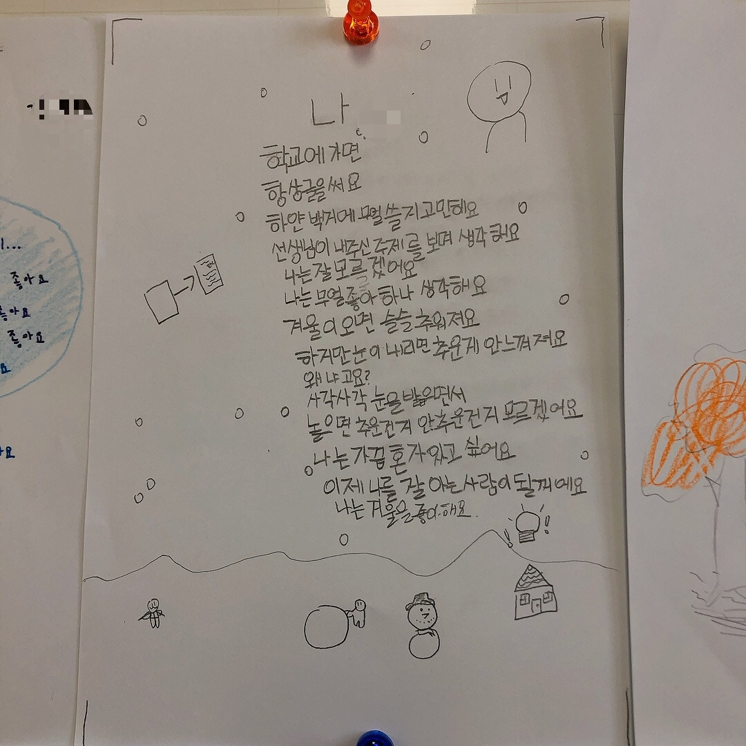 겨울, 눈, 눈싸움, 핸드폰, 엄마, 게임 등 자신이 좋아하는 걸로 시를 쓰고 그림을 그리며 즐거워 보였다.