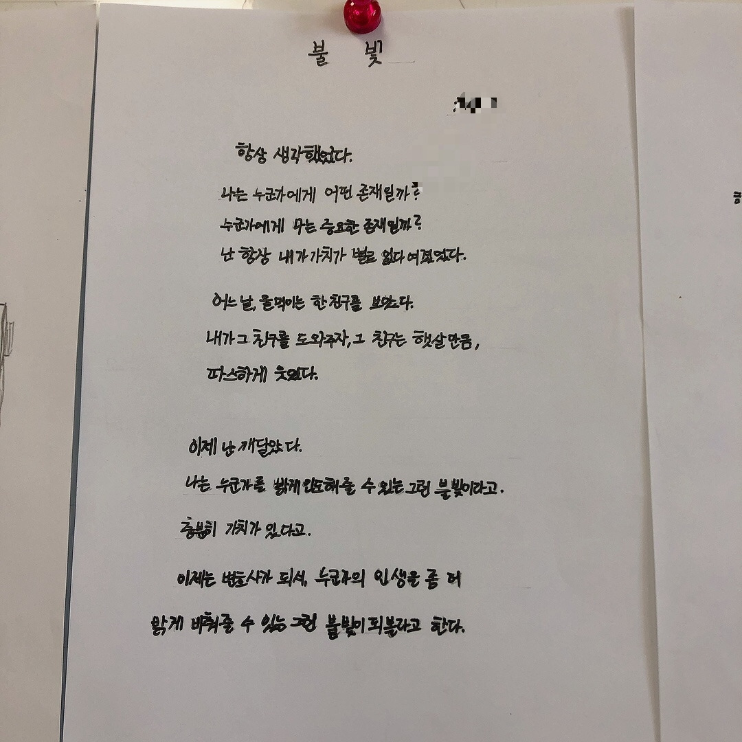 자신의 꿈인 변호사가 되어 누군가의 인생을 좀 더 밝게 비춰줄 수 있는 그런 불빛이 돼보려고 한다는 아이의 시는 멋졌다.