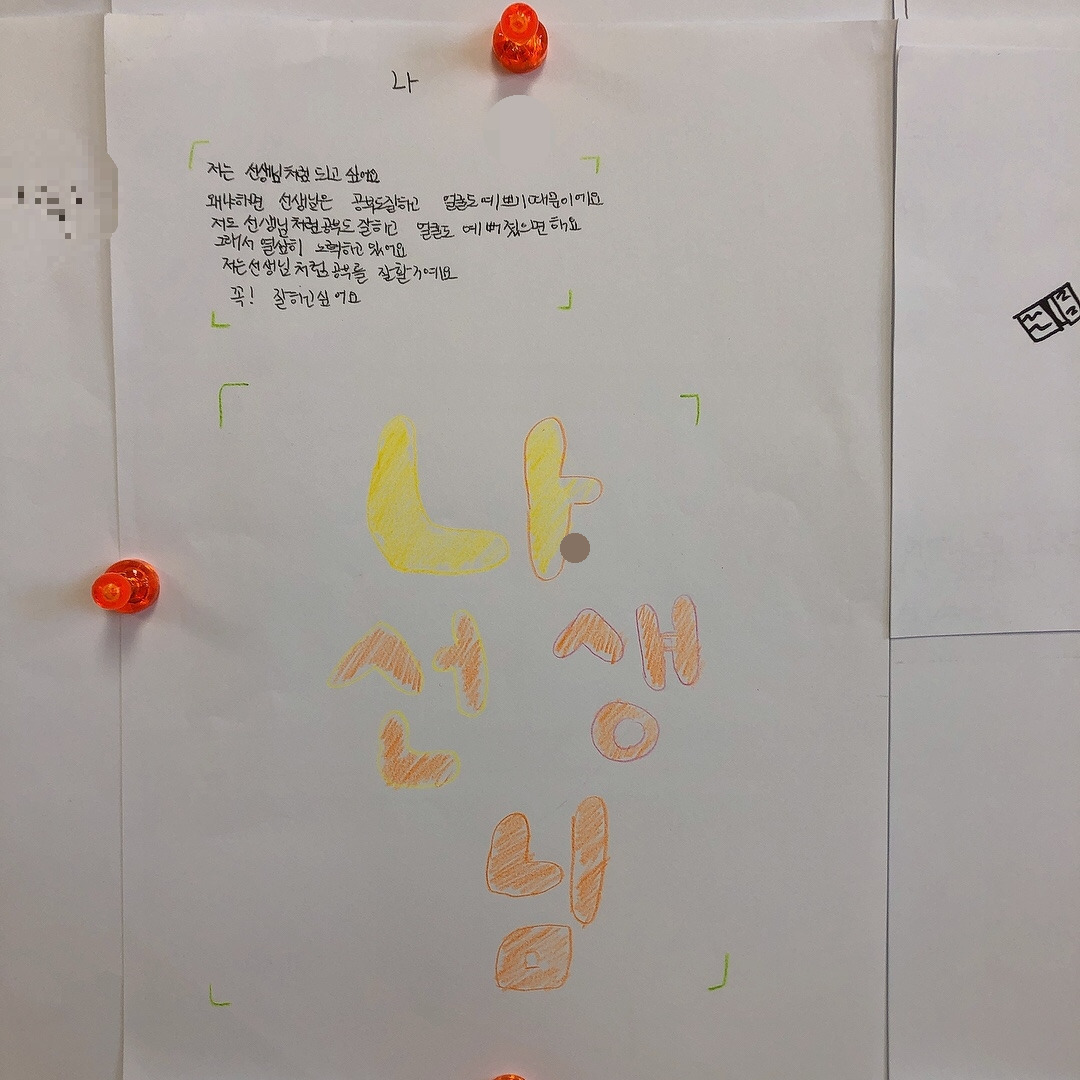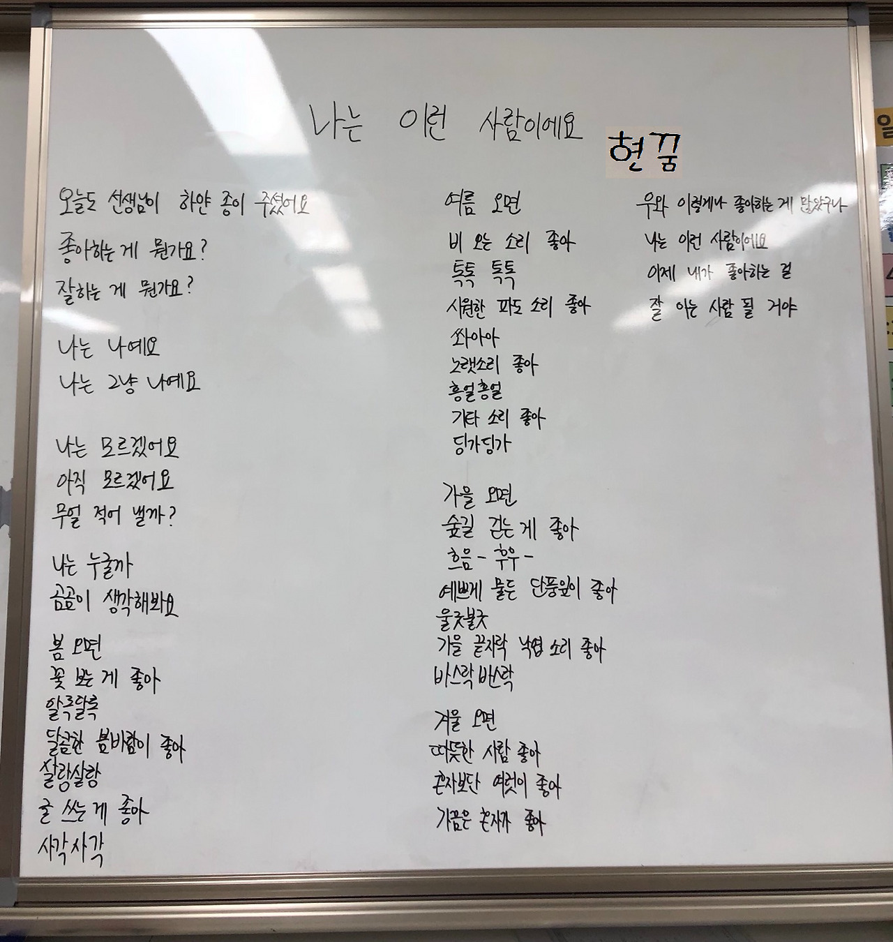 특기 또는 흥미, 그냥 채워야 할 칸이 아니라 나의 이미지를 각인시킬 수 있는 하나의 방법이다. 근데 아이들은 나를 소개하기를 어려워한다. 낯 간지러워한다. 다른 주제보다 ‘나’에 대해 시를 쓸 때 더 고민하고 어려워하는 것 같았다. 사물이나 현상에 대해서는 잘 표현하다가도 ‘나’에 대해 표현할 때면 쉽게 시작하지 못했다. 이건 어른인 나도 마찬가지인 것 같다. 언제나 어려운 질문, 나에 대한 것이다.