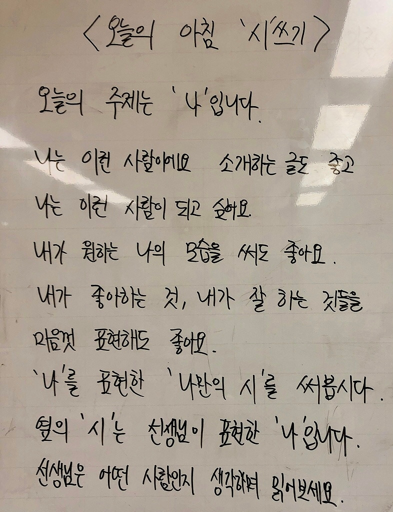 그래서 세 번째 시 쓰기 주제는 ‘나’였다. 나는 이런 사람이다 소개하는 글도 좋고 나는 이런 사람이 되고 싶다 내가 원하는 나의 모습을 써도 좋다고 오늘의 글쓰기 주제를 설명해 주었다. 자신이 좋아하는 것, 잘하는 것들을 마음껏 표현해도 좋으니 ‘나’를 표현한 ‘나만의 시’를 써보는 시간이 되길 바랐다.