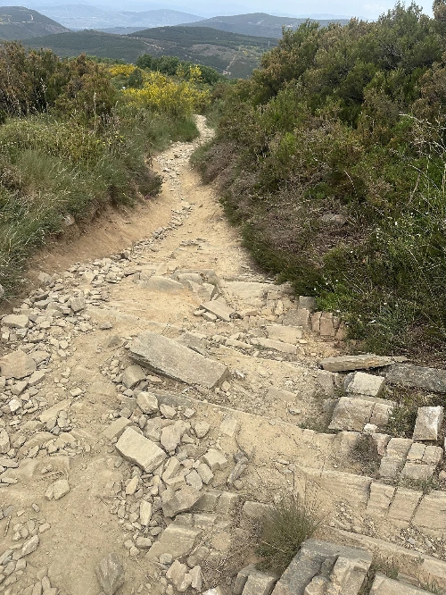 오르막 길이 있으면 당연지사 내리막 길이 있을 거라 생각했지만 오늘 그 두 길을 다 만날 줄은 몰랐다. 나는 평소에도 내리막길을 더 힘들어하는데 내리막과 돌길의 조합은 나에게 최상의 난이도다. 오늘은 큰 배낭도 함께다. 튀어나온 돌과 자갈들 때문에 온몸이 긴장되고 다리에도 힘이 더 많이 들어간다. 오늘은 내가 왜 스틱을 중간에라도 사지 않았을까 조금 후회가 되었다.