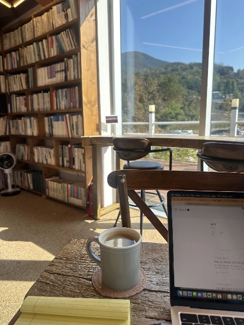 인테리어가 예쁘기도 하지만 특색 있고 책도 많은 곳이다. 브런치 글도 쓰고 책도 읽는다.