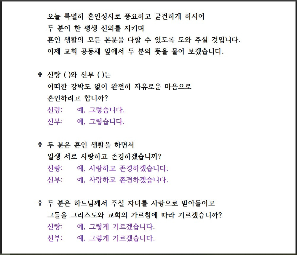 사전에 미리 신부님과의 면담 시간을 가졌는데, 어떤 서약서에 서명을 하기도 했다. 비교적 쉽게 ”네 “하고 대답할 수 있는 질문이었는데, 결혼 후 자녀들도 성당에 데려가 성(聖) 가족을 이루기로 약속하는 대목이 마음에 걸렸다. 자녀란 아직 상상할 수 없는 미지의 존재인데 성당에 데려오겠다는 다짐을 하는 게 맞는 건지, 내가 잘 지킬 수 있을지 자신이 없었다. 신부님 앞에서 거짓말을 할 수는 없었기에 스스로 그러기로 다짐을 한 후 대답을 했다.