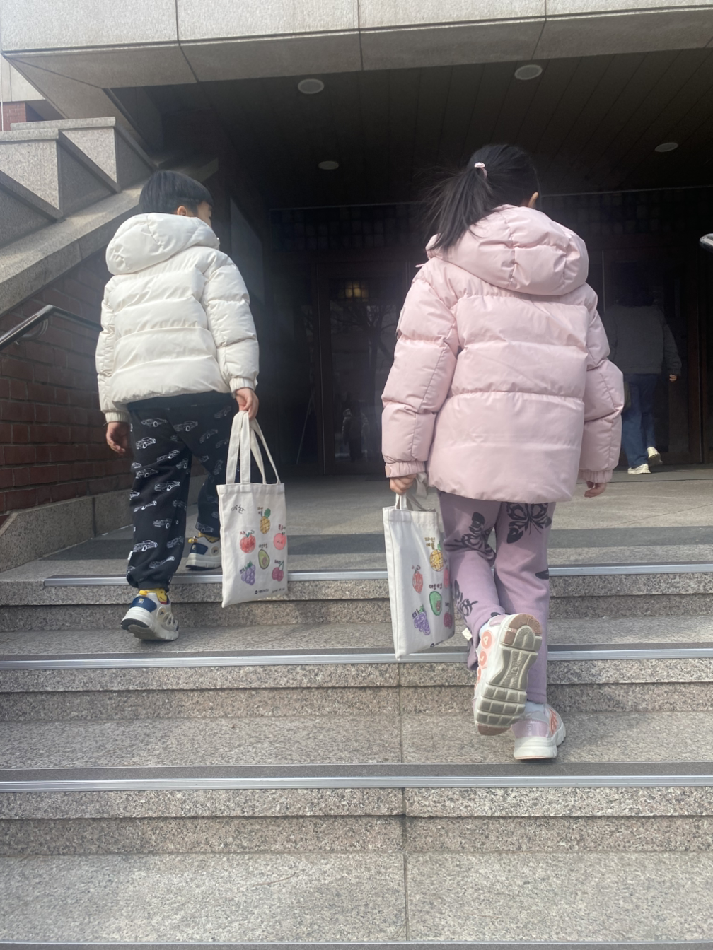 4시 정각이 되자, 신부님과 복사단들이 정해진 의식을 치르기 시작했다. 뭐가 뭔지 모르지만, 아이들에게 친근만 말투로 인사를 건네시는 신부님은 유머러스하면서도 진지하게 성경 구절을 풀어 쉽게 설명해 주셨다. 미사를 마치자 담당자로 보이는 분이 마이크를 잡고 전달사항을 말씀해주셔서 귀를 기울였다. 아이들만 선생님을 따라 지하로 내려가 교재를 받고 교리수업을 듣는다고 해서 부모들은 1층 카페 공간에서 기다리게 되었다. 어리둥절함과 설렘이 교차하는 가운데, 누군가 알은체를 하며 다가왔다.