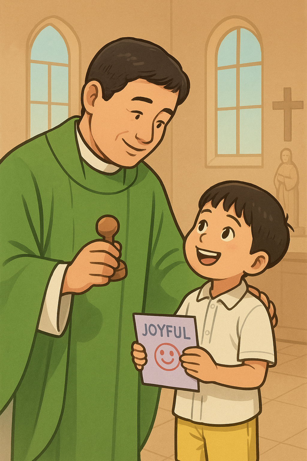 아이는 어리둥절한 표정으로 ‘기쁨통장’을 가지고 나갔다. 신부님께서는 약속대로 도장을 두 개 찍어주며 아까 용감하게 잘 말했다고 칭찬을 해주셨다. 아이는 덩실덩실 춤이라도 출 듯한 표정으로 나에게 달려와서 품에 안겼다.
