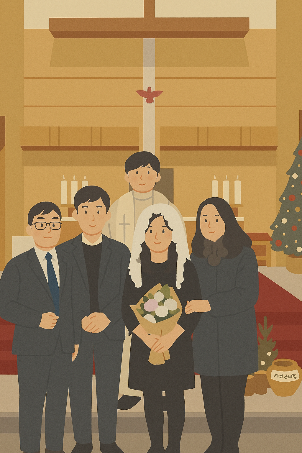 SNS에 올린 세례식 사진을 보고 연락 온 30년 지기 친구가 보내온 메시지의 첨부파일을 확인해 보았다. 무려 10년 전, 기억도 가물가물한 신혼 초에 친구네 부부 혼인성사 때 증인으로 섰던 우리 부부의 사진이었다.