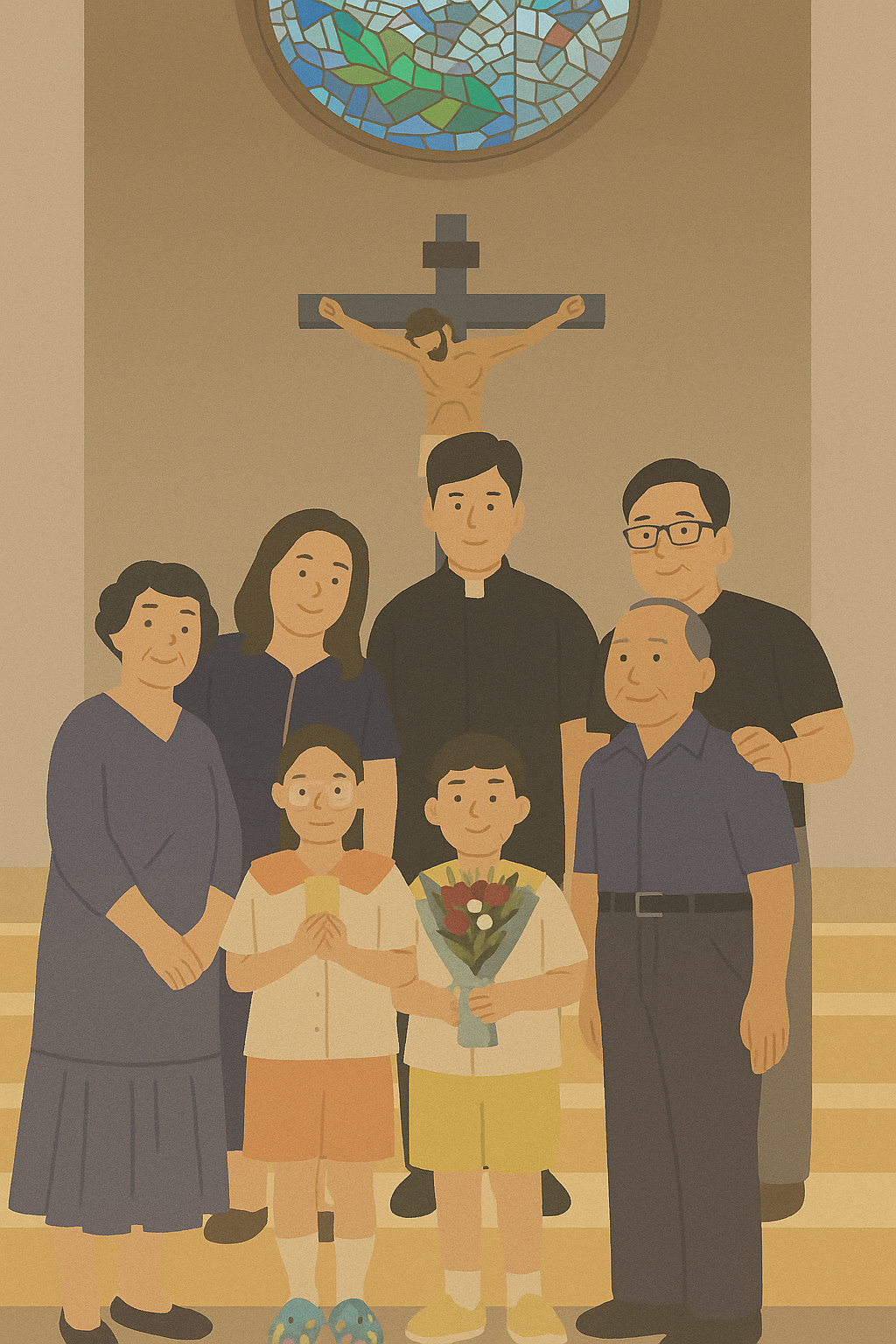 사진을 보고 너무 놀라서 나도 모르게 소리를 지르고 가족들에게 이 사실을 공유하였다. 그곳이 어디였는지 물으니 당시 친구네 본가가 있던 하O동 성당이라고 했다. 찾아보니 정말 그 시기에 우리 신부님이 그곳에서 보좌신부 생활을 했던 기록이 있었다. 그 사이 10년이라는 세월이 흘러 나는 두 아이를 초등학교에 입학시킨 후에야 비로소 우리 동네 성당의 문을 두드렸다. 우리 가족이 성당생활을 시작하기 불과 한두 달 전에 그 신부님이 우리 성당의 부주임 신부님으로 발령받아 오셨다는 사실이 그저 우연이라고 하기에는 너무나 신기하게 느껴졌다. 아이들도 모두 손뼉을 치고 폴짝 뛰며 재미있어했다. 꼭 다음 주에 신부님께 말씀드려 보자고도 했다.