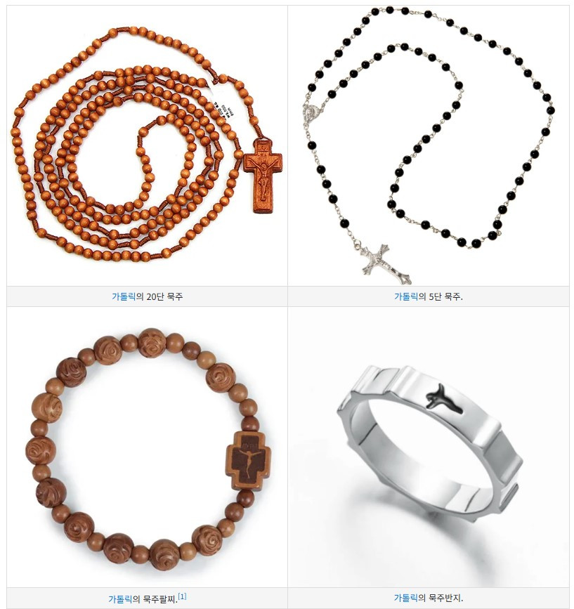 묵주란, 천주교에서 기도를 할 때 사용하는 구슬 목걸이 같은 것인데 원래는 목에 걸 만큼 길다. 기본적으로는 10알씩 5단으로 구성되어 있고 '묵주기도'라는 기나긴 기도를 바칠 때 사용하는 성물이다. 이것을 좀 더 간단한 형태로 만든 팔찌가 '묵주팔찌'이고, 더욱 간단한 형태로 만든 게 바로 '묵주반지'인 것이다.