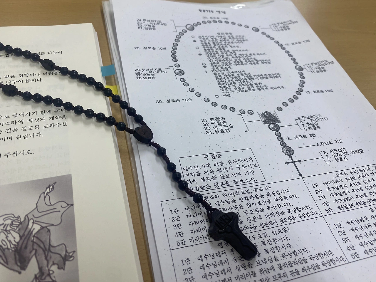 어머님께서 진작에 주신 가벼운 나무 묵주, 부모교리 시간에 구슬을 꿰어 직접 만든 묵주팔찌, 그리고 장롱에서 꺼내주신 묵주반지까지 다 갖추었지만 정작 나는 '묵주기도'를 다 외우진 못했다. 묵주기도 안에 들어가는 성모송과 사도신경, 주님의 기도 등을 부분적으로 외우긴 했지만 완벽하진 않다. 그럼에도 불구하고, 얼마 전 세례식 때 축성받은 뒤로 손가락에 끼고 있는 묵주반지를 빙글빙글 돌리다 보면 왠지 마음이 안정되는 기분이 든다. 검색하다가 알게 된 것인데, 김연아 선수나 아이돌 카리나도 묵주반지를 끼지 않으면 불안한 마음이 든다며 반지에 대한 애정을 드러냈다고 한다.