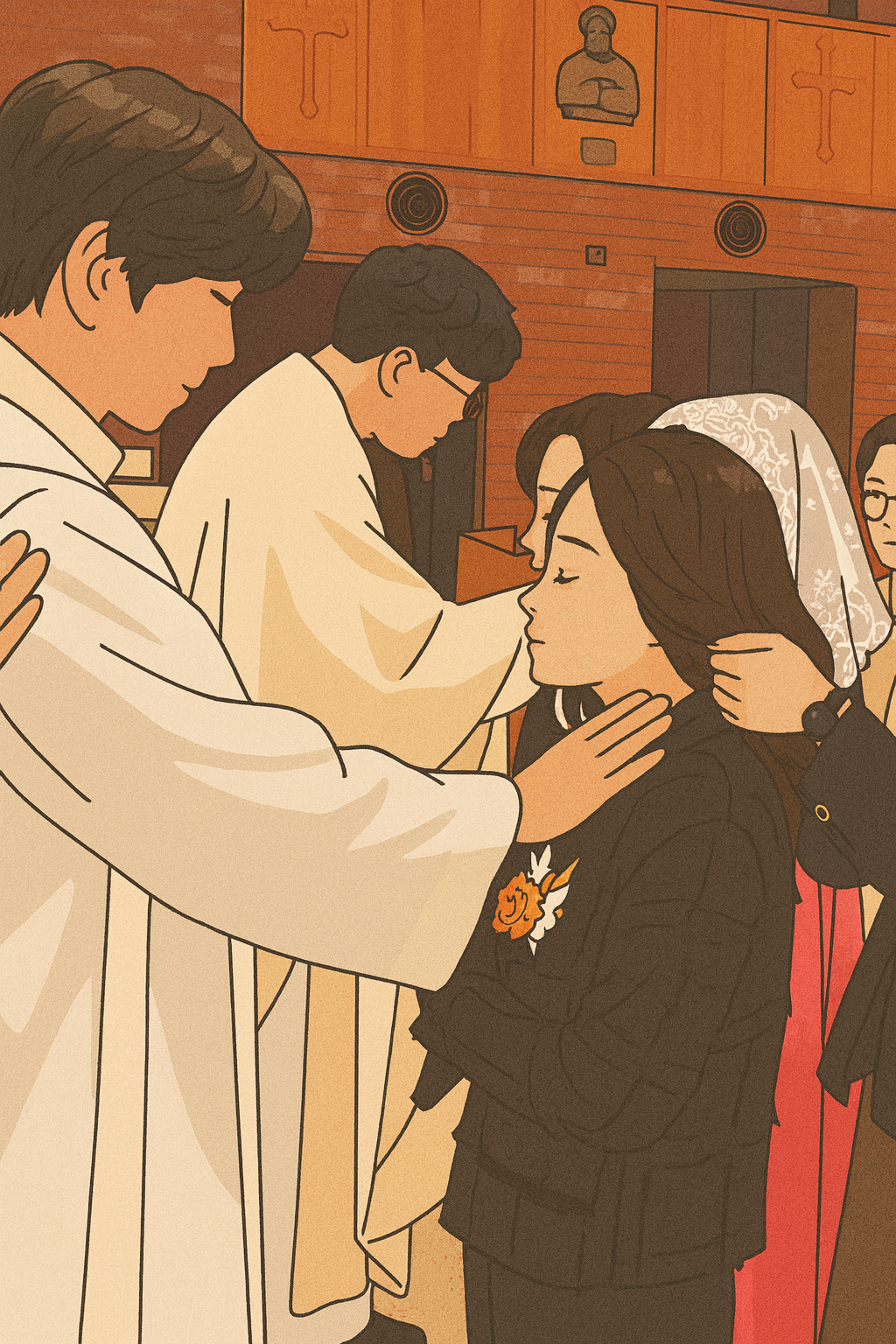 6개월 간의 예비자 교리 과정을 마무리하며 마치 졸업식과도 같은, 아니 입학식이라고도 할 수 있는 세례식이 시작되었다. 어제 배운 대로 줄을 맞춰 나가니 ‘우리 가족 세례 전문’ 부주임 신부님께서 기름도 바르고 성수도 뿌려주셨다. 대모님께서 명동성당에서 사다가 '미사보'도 씌워주었다. 이마에 십자가 모양으로 기름을 바를 때에는 속으로, 오호 이게 말로만 듣던 그 '눈에 보이지 않는 인호'를 새기는 것인가? 하고 기대감이 차올랐다. 앞으로의 내 삶에 보이지 않는 투명한 보호막이 씌워지는 느낌이었다. 처음에는 긴장했는데 앞으로 나갔다가 돌아오는 것이 반복되다 보니 점점 여유를 되찾았다. 뒤쪽에서 나를 바라보고 있는 가족들이 하나 둘 눈에 들어와서 미소를 주고받기까지 하니, 행복이 전율처럼 온몸에 번졌다.
