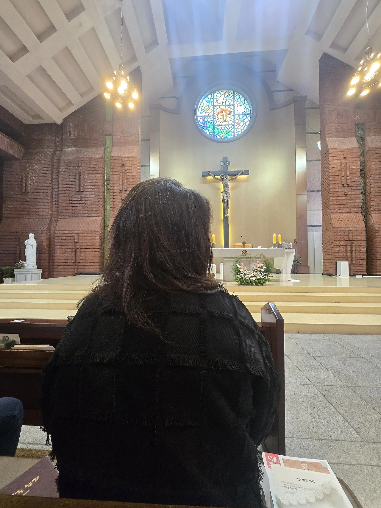 세례식은 주일 11시 교중미사 중으로 계획되어 있었고, 바로 전날인 토요일에 예비신자와 대부모가 함께 모여 연습을 했다. 시작이 저녁 7시였기 때문에 우리는 조금 미리 만나 함께 저녁을 먹었다. 따끈한 우동과 돈가스로 배를 채우고, 우리 성당으로 대모님과 처음으로 걸어 들어가는 길이 마냥 설렜다. 나는 다른 성당에 가보지 않았지만, 요 근래 가족의 세례식과 첫 영성체식 등으로 지인을 초대해 보니 다들 우리 성당이 크고 멋지다고 칭찬해 주어 마치 내 집을 자랑하듯 뿌듯한 마음이 들었다.