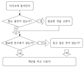 나도 자질구레한 것을 사러 다이소에 즐겨 가는데, 가게에 들어가는 내 머릿속에 생기는 일처리 순서도는 대략 아래와 같다. 사려고 하는 꼭 필요한 물건이 있는가 없는가 여부와 관계없이 문구류 코너에 꼭 들른다는 이야기다. 가서 조금만 둘러보면 살 것이 생기곤 한다.