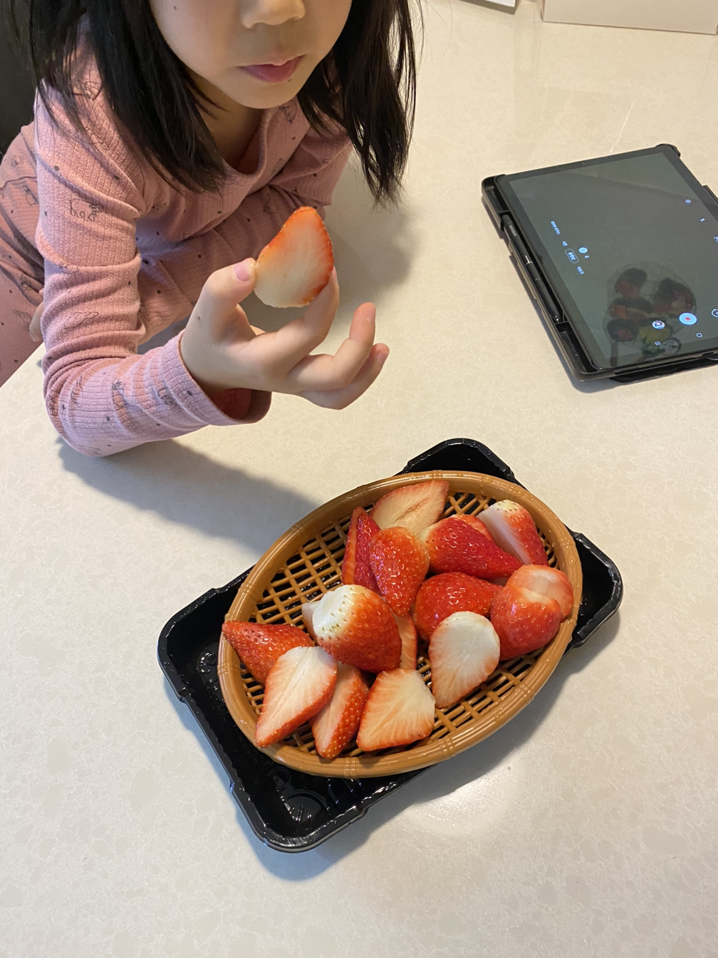 '아이들이 이런 것도 못해?' 하고 놀란 건 의외로 과일 후식을 만났을 때이다. 1학년 중에는 송편이나 딸기 꼭지를 처음 보는 아이도 있었다. 한 아이는 "우왓!! 책에서 보던 딸기 그대로의 모양이야!" 하고 소리를 질렀다. 그동안 그 아이가 먹어 온 딸기는 꼭지가 제거되고 말끔하게 손질된 상태였다는 것을 어렵지 않게 짐작할 수 있었고, 그 말을 들은 나와 배식도우미 어르신은 동시에 웃음을 터뜨렸다. 어느 날 보니 나 역시 내 아이에게 그런 딸기를 제공하고 있다는 것을 새삼 깨달았다. 딸기 꼭지의 처리법을 모르는 아이들은 꼭지째 아삭아삭 씹어서 먹어버리기도 한다.