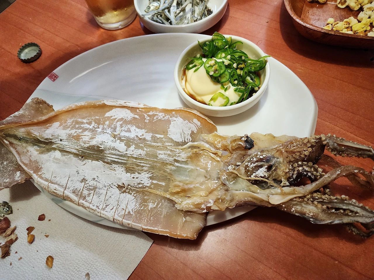 지난번에 왔을 때 배에서 즉시 말린 오징어라 맛있다고 사 왔다는 것을 시켰다가 정말 실망한 적이 있었다. 사장님께 그 오징어는 진짜 아니라고 말한 기억이 난다.