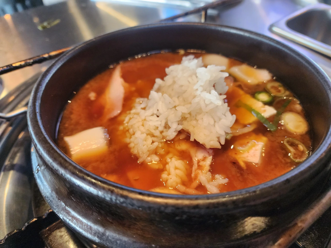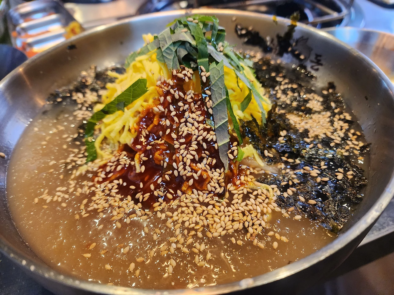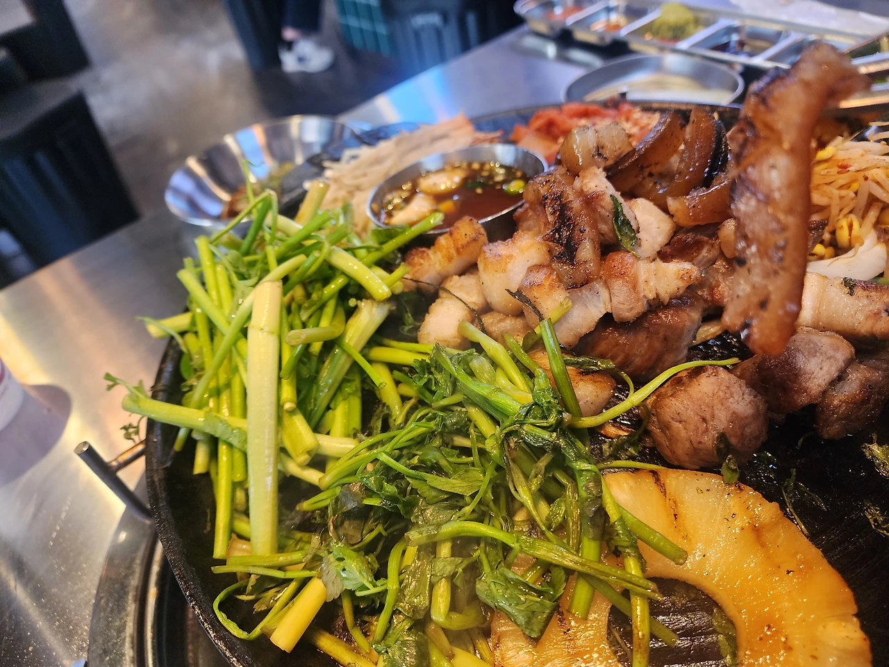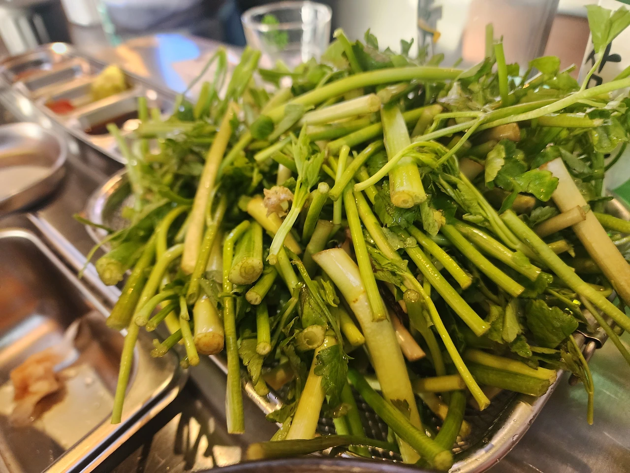 아직도 술을 많이 먹고 다니니 미나리가 필요할 것 같아서 추가로 시켰다. 수북이 쌓인 생미나리를 불판에 올리니 금방 쪼그라들었다. 역시 뜨거운 맛을 봐야 한다.