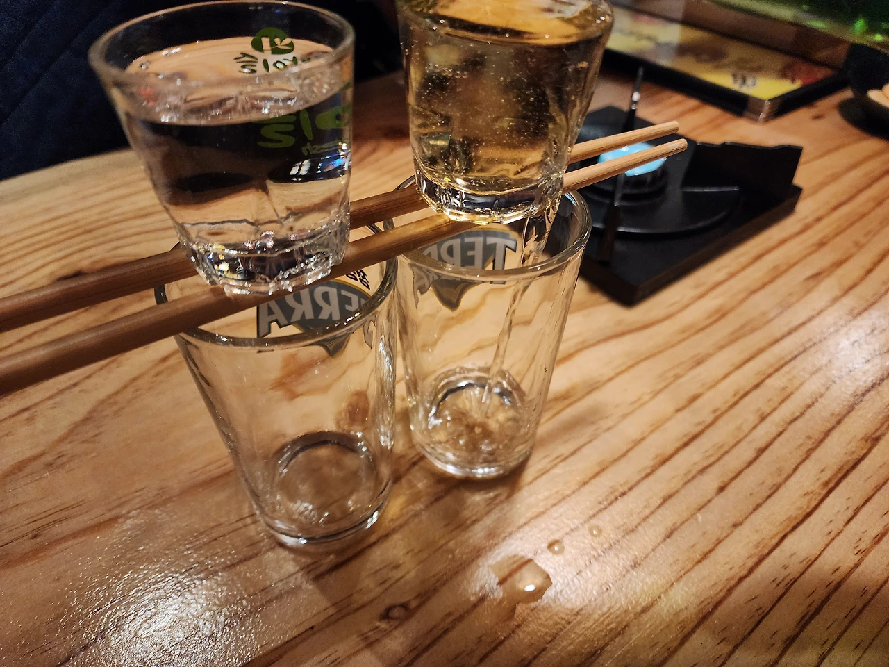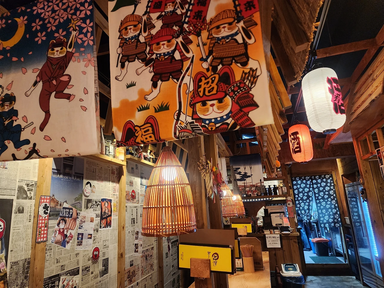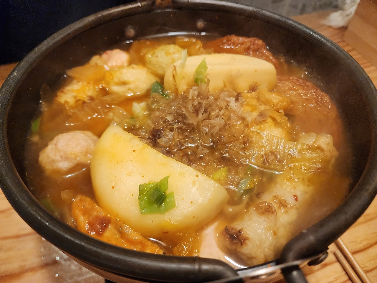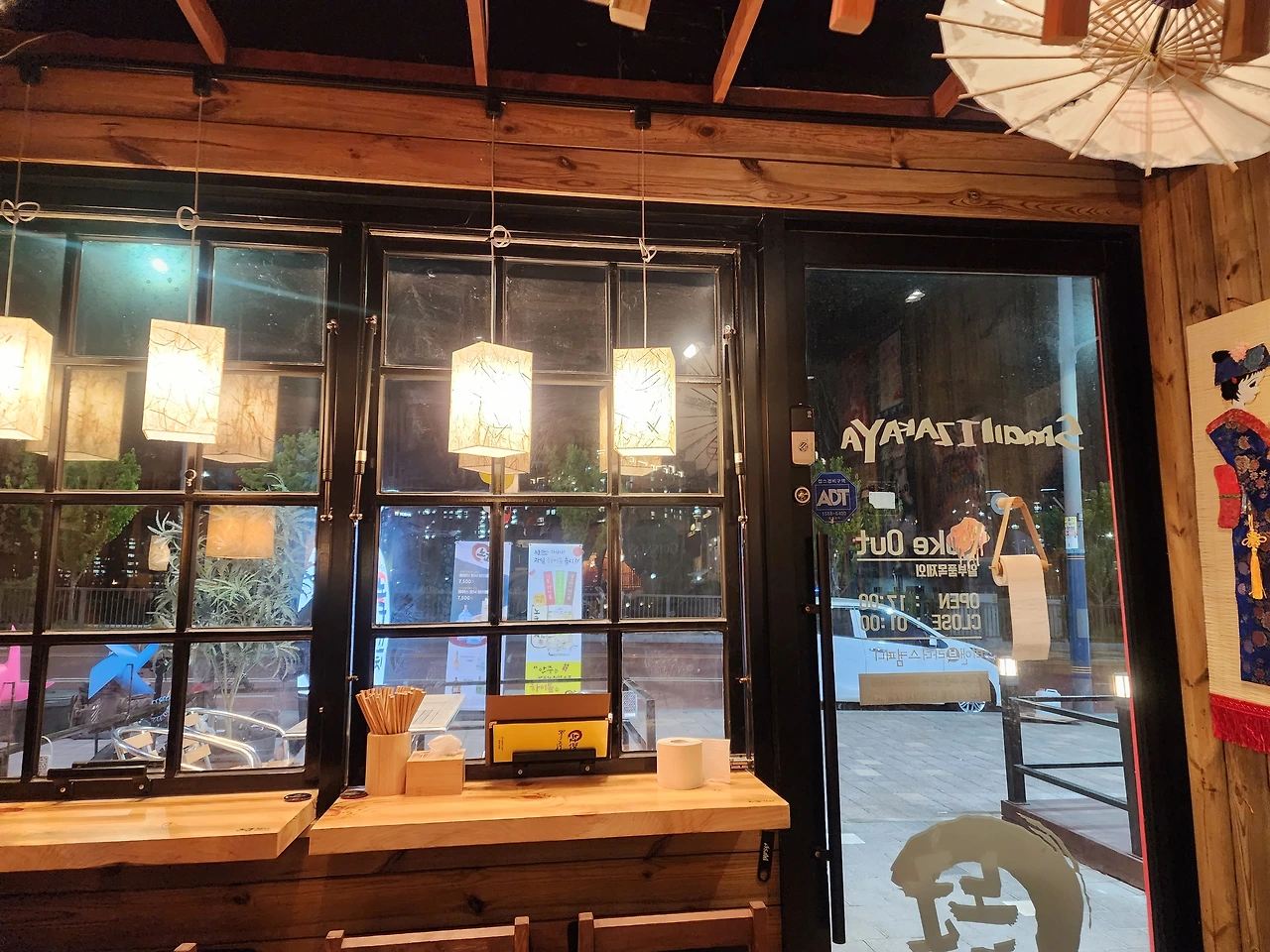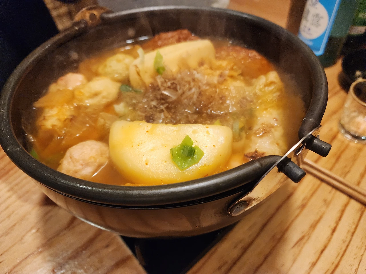 자주 가는 작은 꼬치집에서 그동안 안 먹어 봤던 메뉴를 골랐다. 날씨가 살짝 쌀쌀하니 김치어묵탕이 잘 어울릴 거 같았다. 꼬치집에 앉아 있으니 인테리어 때문에 일본 여행을 온 느낌이 들었다.