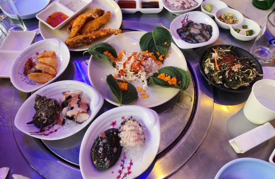 다행히 우연히 들어간 횟집의 음식이 괜찮았다. 뭐가 그리 푸짐하게 나오는지 한상 가득하다 못해 넘쳐서 음식을 옆테이블에 놓아야 할 지경이었다.