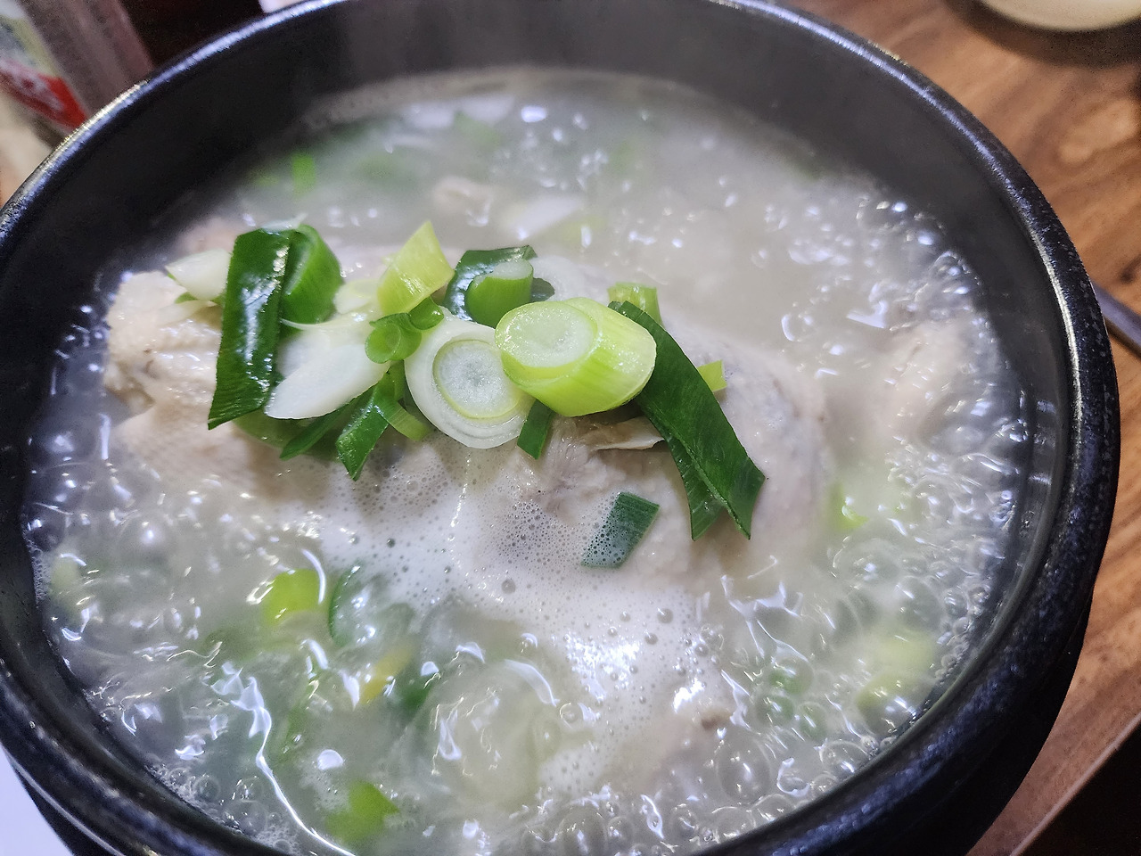 뚝배기에 삼계탕이 보글보글 끓고 있는 상태로 나왔다. 다른 분들은 식사를 다 하신 뒤라 혼자서 야금야금 맛있게 먹었다.
