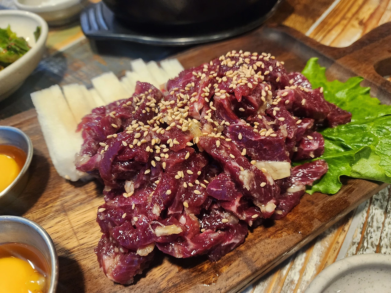 또 사장이 멋진 성우톤 목소리로 메뉴를 소개하니 나름 웃기기도 학고 진지하기도 했다. 사장님 추천으로 일단 육회를 먼저 시켰다.