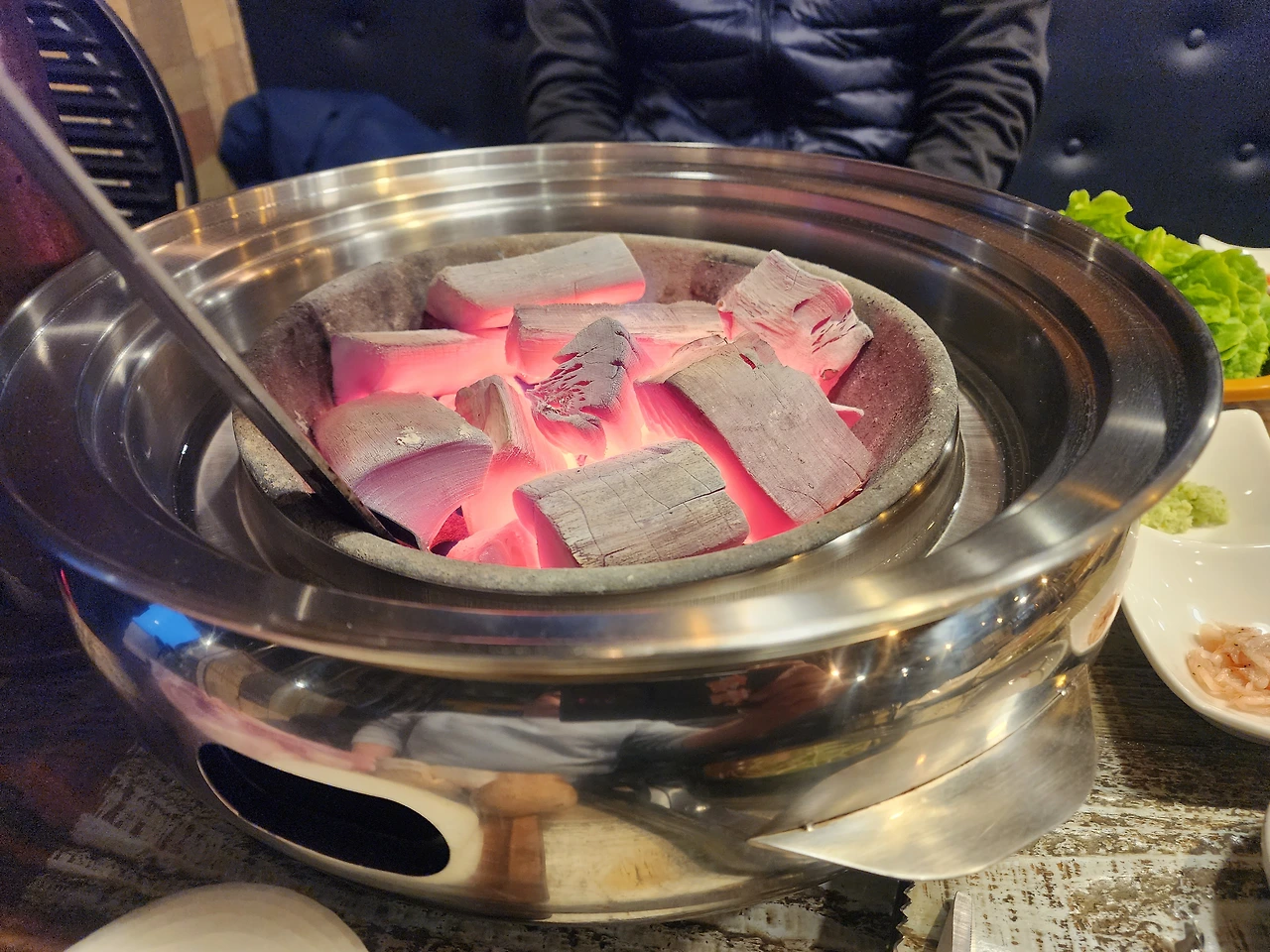 테이블에 올라온 숯이 사장님 열정만큼 빨개서 싱싱한 소고기를 금방 익게 만들어서 눈 깜짝할 사이에 없어지게 만들었다.