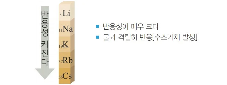 그런데 리튬(Li), 나트륨(Na), 칼륨(K), 루비듐(Rb), 세슘(Cs)등의 금속 원소들은 물과 만나게 되면 최외각 전자가 떨어져 나가는 반응이 격렬하고도 빠른 속도로 일어나게 된다. 이 과정에서 수소 기체가 생성되고 반응 시 방출된 열로 인해 수소 기체의 폭발이 발생하는 것이다. 2018년 4월에 내가 보였던 금속 나트륨과 물 사이의 반응이 바로 그것이다. 그리고 물이 이 금속 원소들과 반응하게 되면 염기성을 띠게 되고 페놀프탈레인 지시약과 만나서 붉게 변하는 성질을 보이게 된다. 그래서 리튬(Li), 나트륨(Na), 칼륨(K), 루비듐(Rb), 세슘(Cs)등의 물질을 알칼리 금속(Alkai metal)이라 한다. 알칼리 금속이 물과 반응하는 정도는 원자번호 큰 순서에 따라 세슘(Cs), 루비듐(Rb), 칼륨(K), 나트륨(Na), 리튬(Li) 순으로 증가한다. 만약 그날 실험에서 나트륨을 리튬으로 대체했다면 그 난리는 나지 않았을지도 모른다.