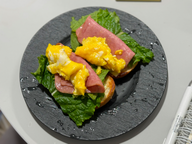 통밀빵에 샌드위치햄과 치즈를 겹겹이 쌓는다.