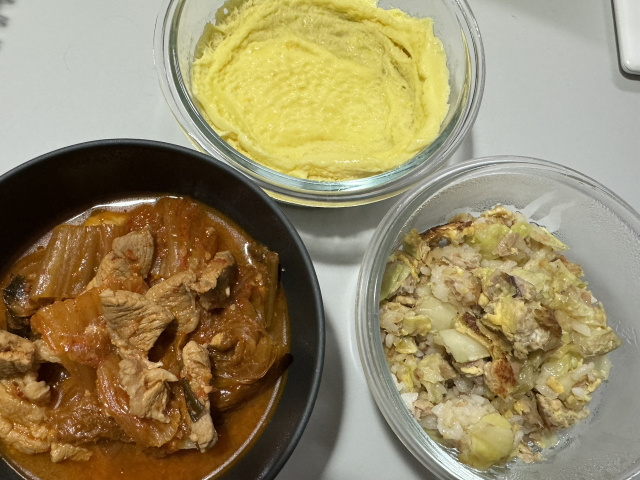 계란찜은 푸르딩딩하게 먹으려면 전자레인지 시간 조절(약으로 4분)을 잘해야하는데 이날은 좀 많이 돌렸는지 푹 가라앉았다.