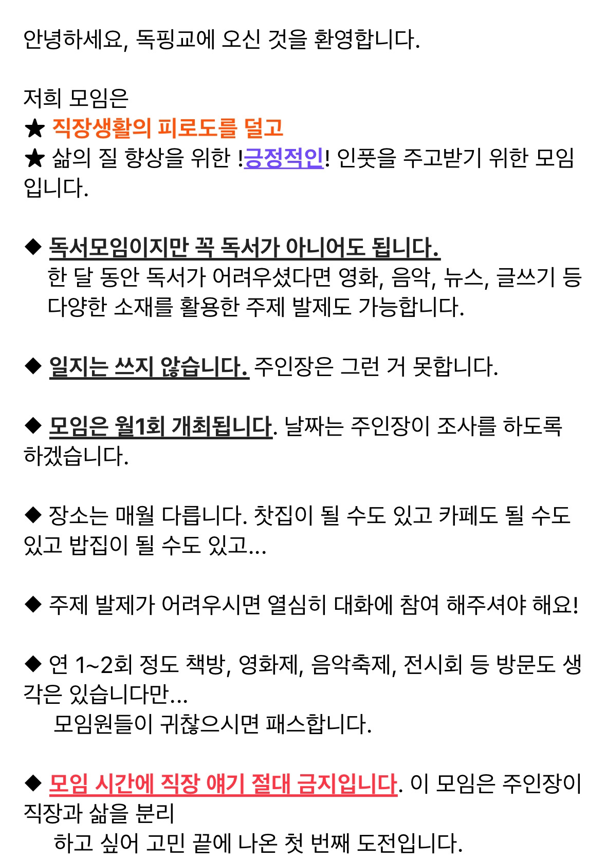 기존에 가입했던 독서모임이 우리지역 주민이면 누구나 가입할 수 있는 소모임이었다면, 내가 만든 독서모임은 같은 회사 직원들을 대상으로 한 모임이다.