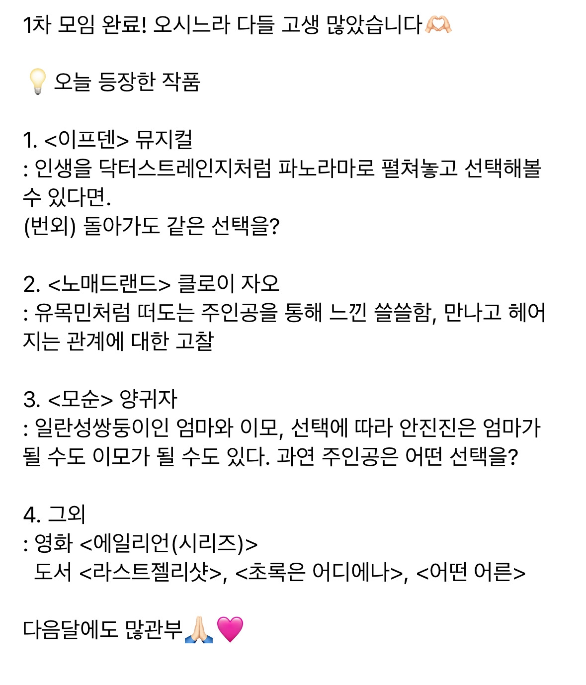기록을 안 하겠다던 나였지만, 그날 등장한 수많은 작품들을 놓치기에는 아쉬웠다. 언젠가 오늘의 대화를 떠올리며 ‘그때 우리가 얘기 나눴던 작품 이름이 뭐였더라’ 궁금해질 때 참고할 수 있도록 간단하게 정리해 밴드에 올렸다.