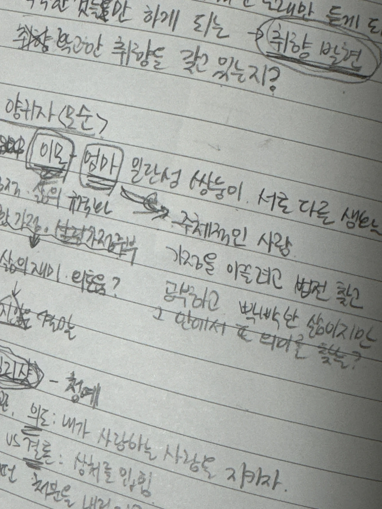 전날 노트에 정리해 간 발제 주제를 처음으로 한 명씩 돌아가면서 자신이 읽은 책이나 봤던 영화에 대해 얘기를 나누었다. 각자의 성향이나 관심사가 다르기에 처음에는 약간의 어색함이 있었지만 곧잘 다양한 주제를 도출해내었다. 특히나 발제자의 주제 표현 방식이나 취향을 구체적으로 들여다보고싶을 정도였으니. 시간 가는줄 모르고 얘기하기 바빴다.