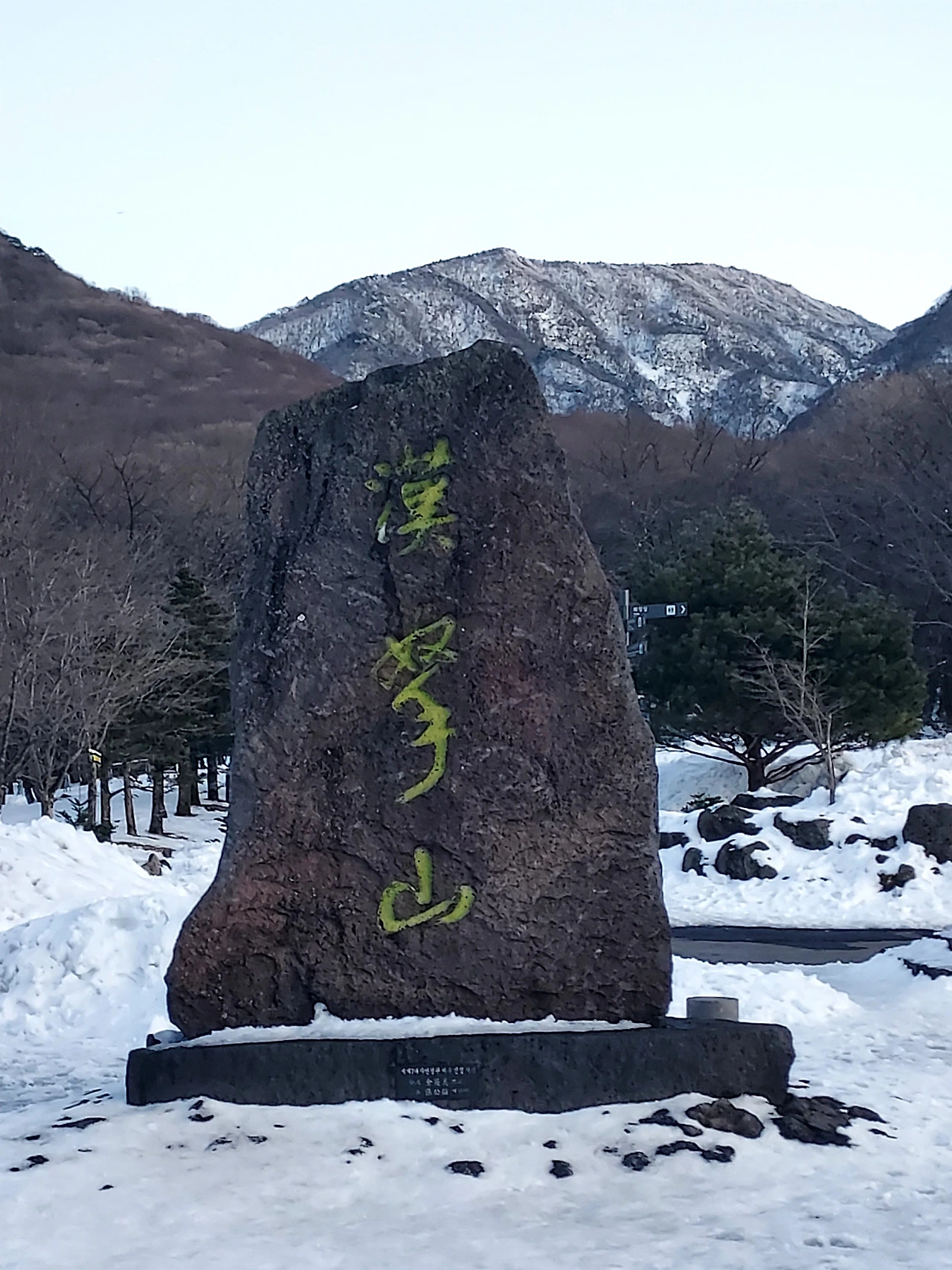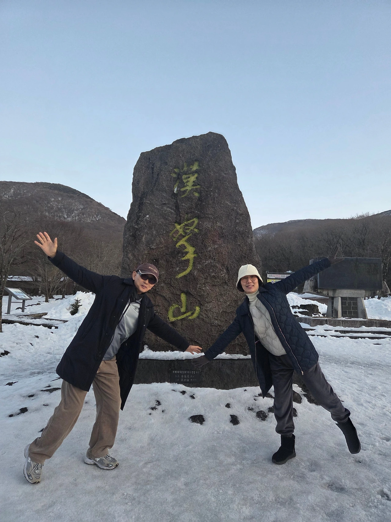 '한라산'이라 새겨진 비석 앞에서