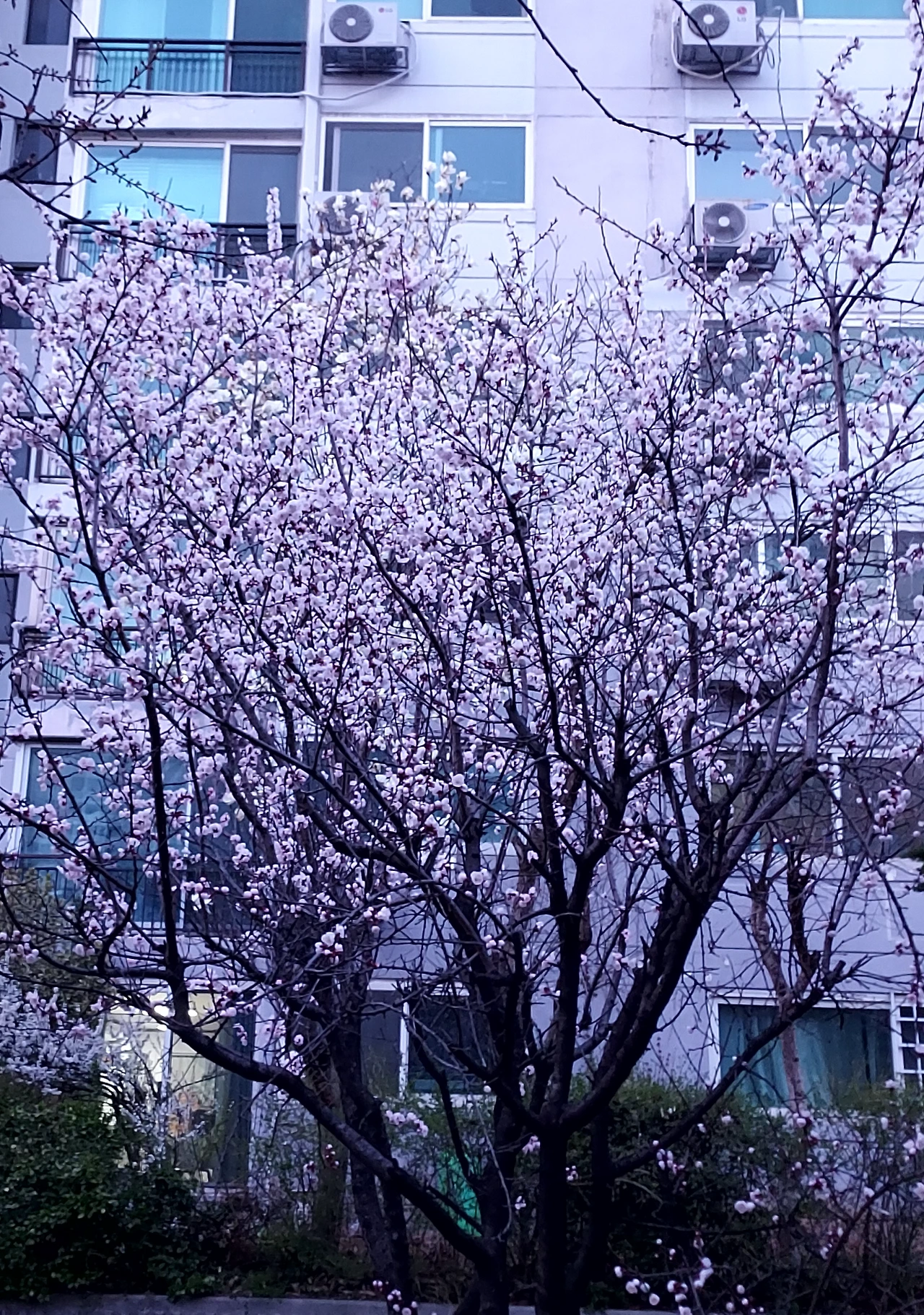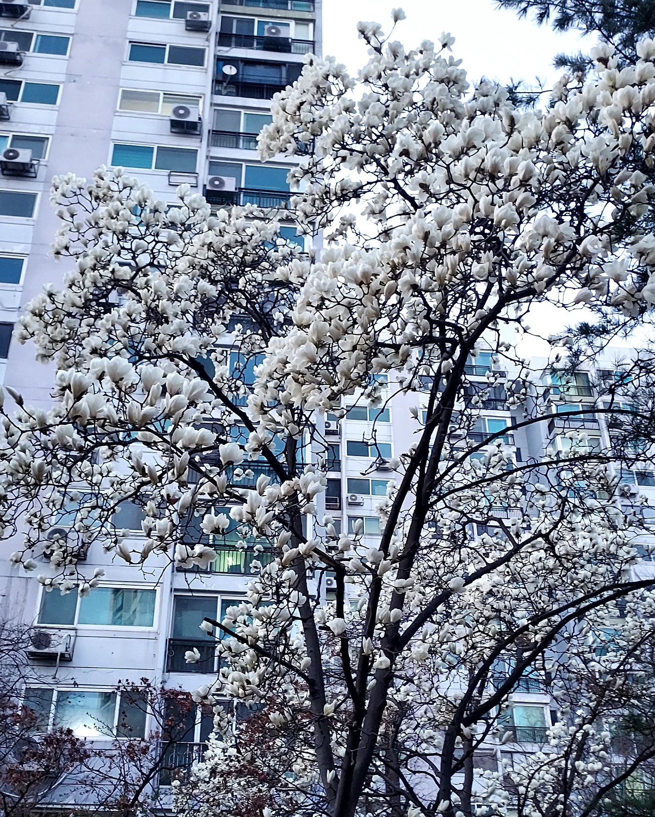 아파트 앞, 하얀 목련과 벚꽃이 앞다투어 핀다.