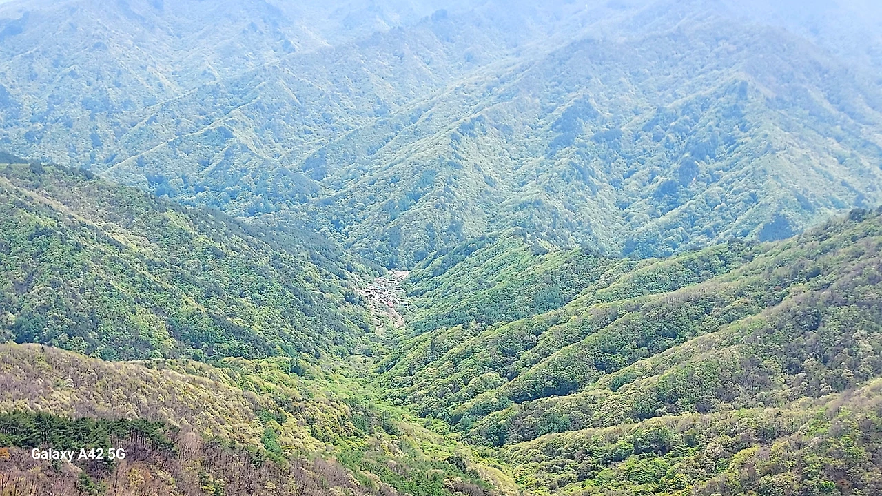 팔랑치에서 내려다본 산골마을은 연둣빛