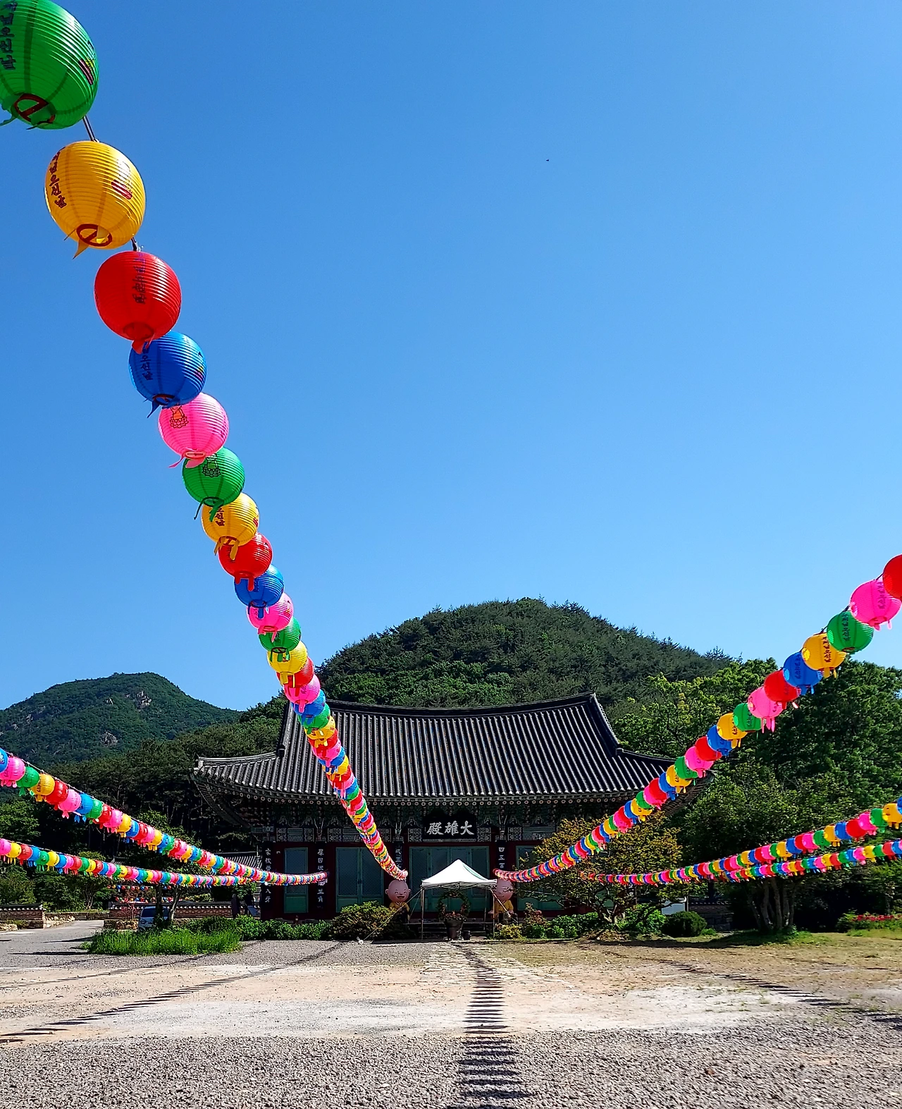 대웅전 앞 여러 줄의 연등은 각종 색깔의 풍선을