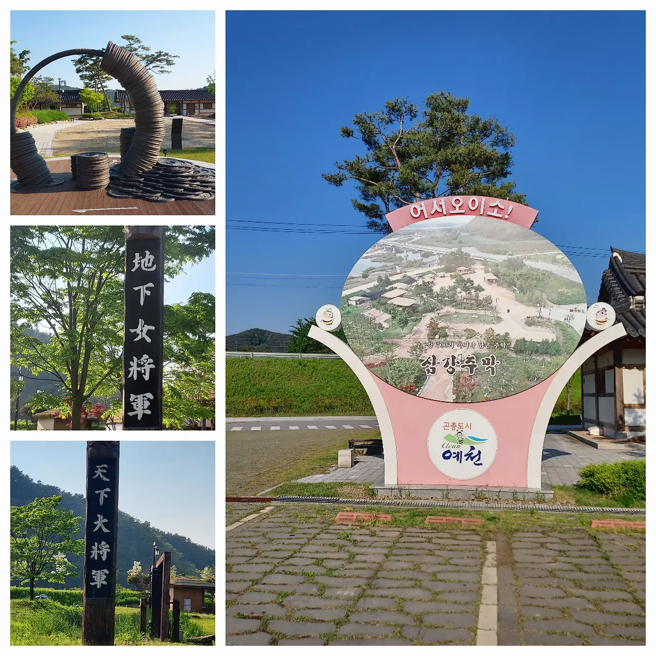 입구엔 엽전 꾸러미와 장승 조형물이 여행객을