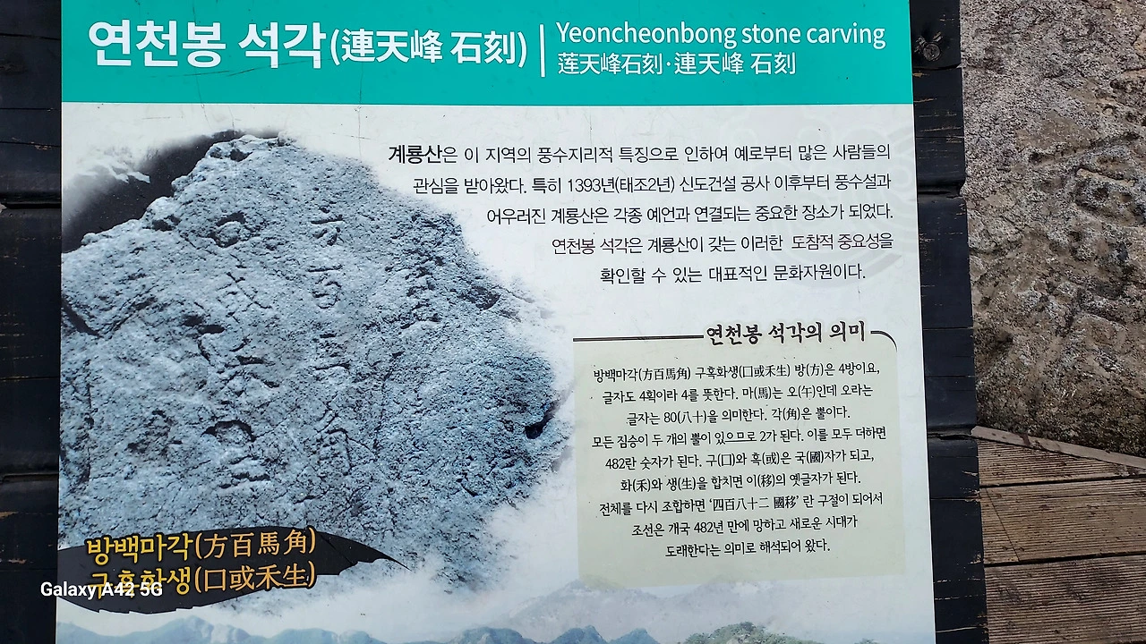 '연천봉 석각', '연천봉 낙조' 안내판이 눈에 띈다.
