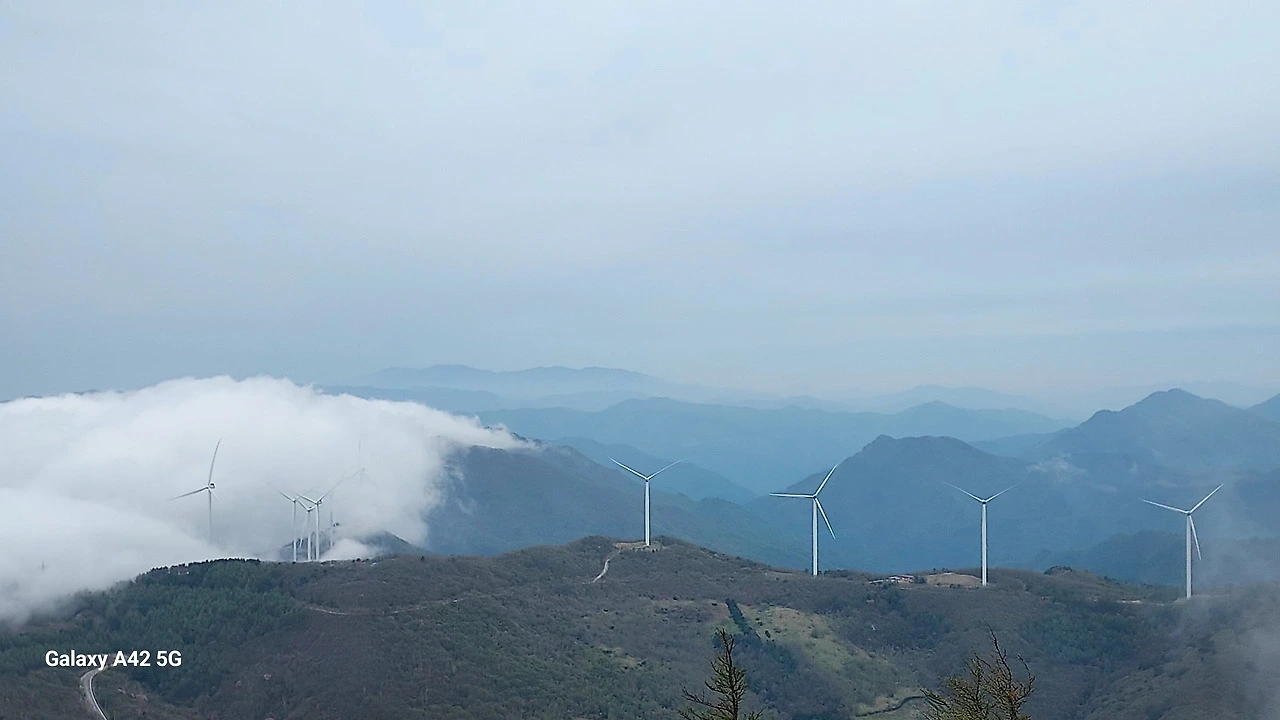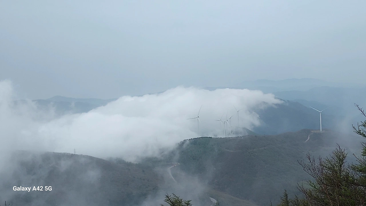 구름 너머, 풍력발전소의 날개가 돌아간다.