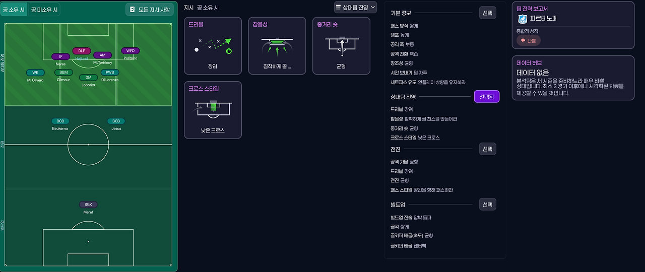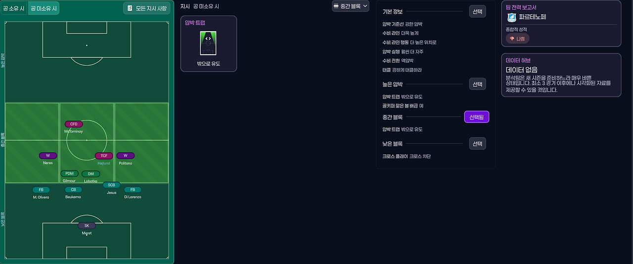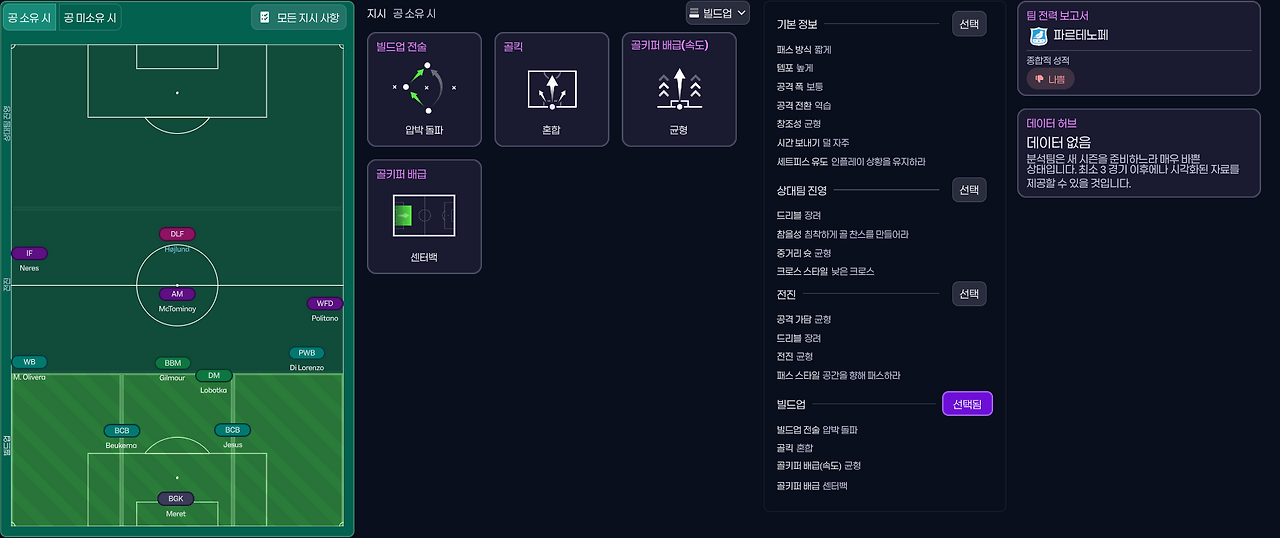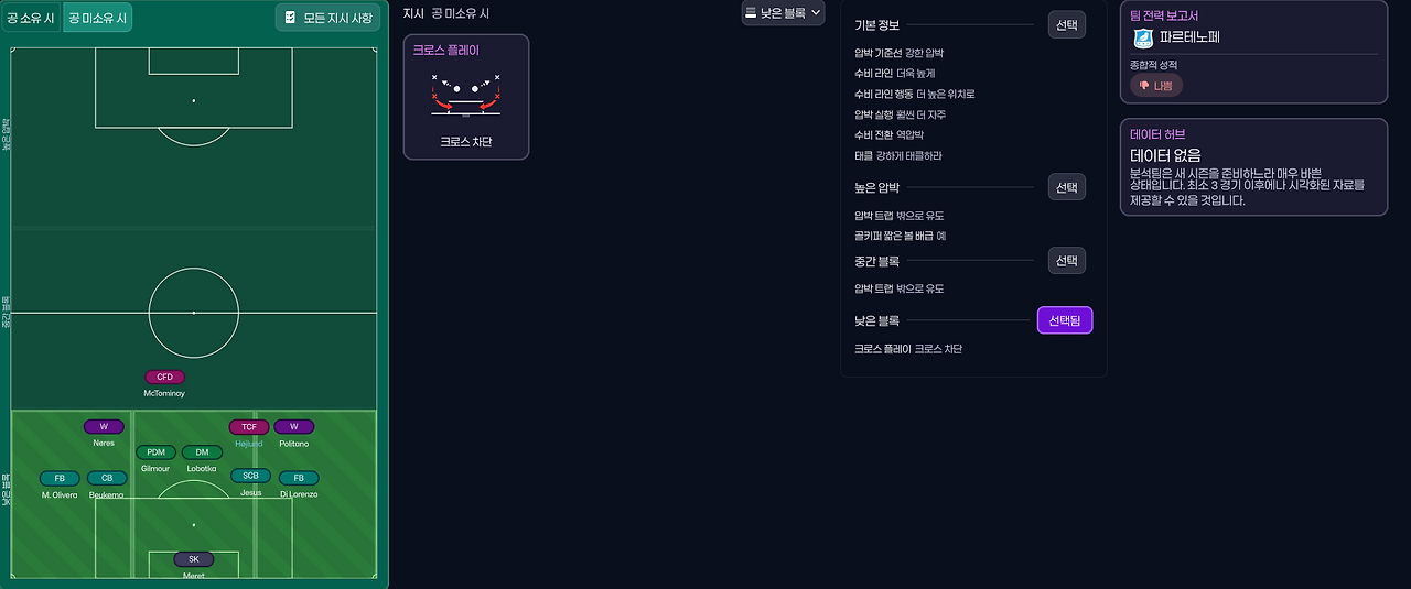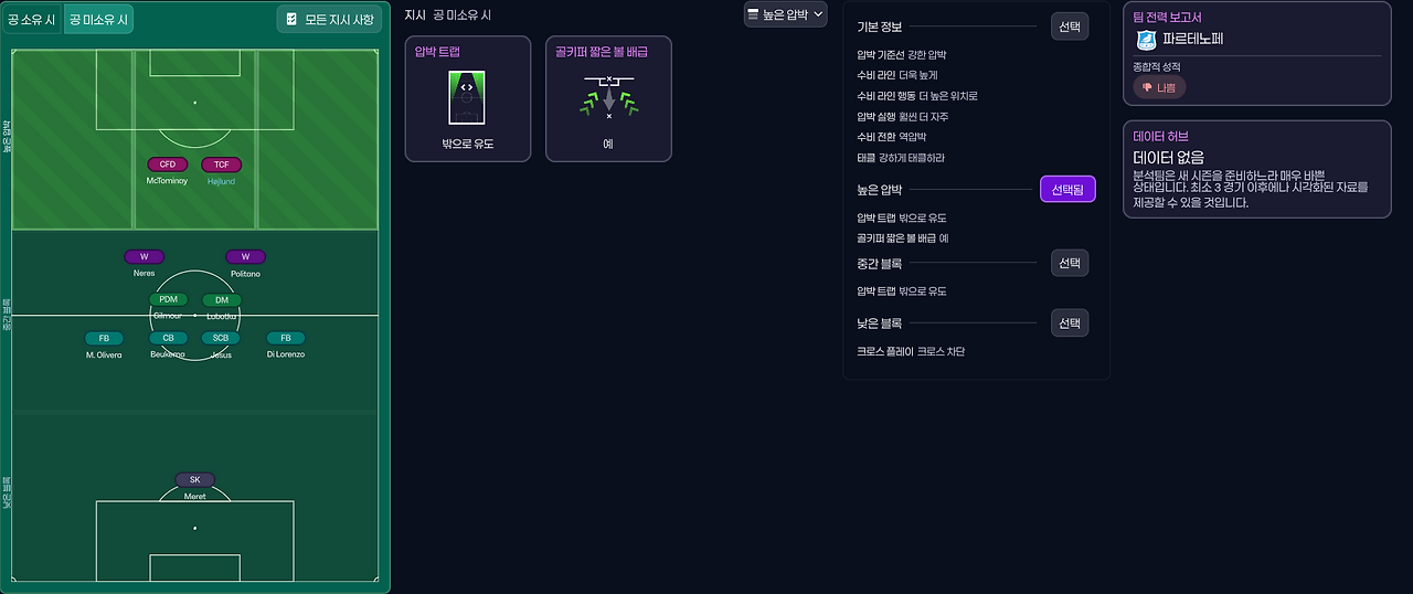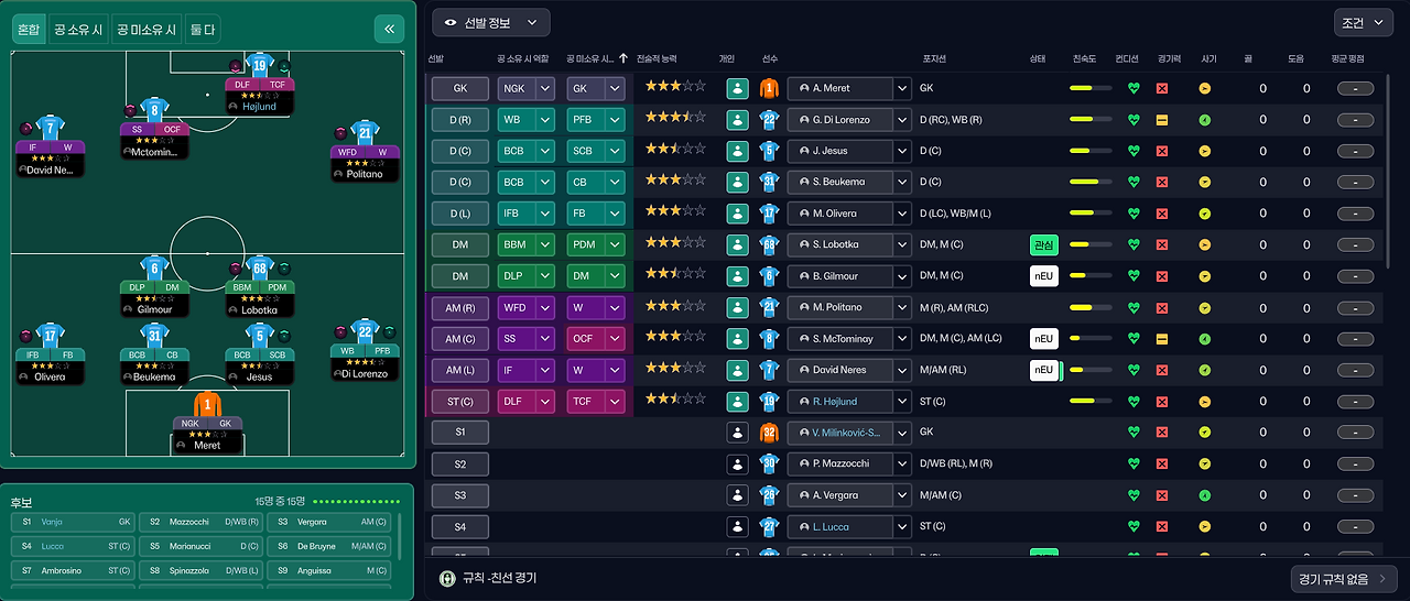 FM2026 기준 최신 로스터의 나폴리를 사용해, 선수 개개인의 특징에 맞춘 전술을 직접 설계했다. 다만 내가 나폴리의 경기를 직접 본 건 25-26 시즌 챔피언스리그 매치데이1, 맨체스터 시티 VS 나폴리 가 전부였기에 데이터가 너무나도 부족했고, 결국 위키의 도움을 받아 각 선수들의 특징을 정리하고 전술을 만들었다. 이번 글의 목적은 “전술이 실제 경기에서 어떤 문제를 드러내는지”를 경기 데이터로 검증해보고 정리하는 것이었다.