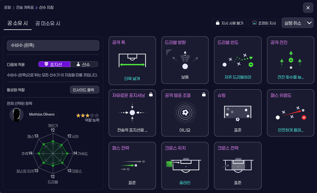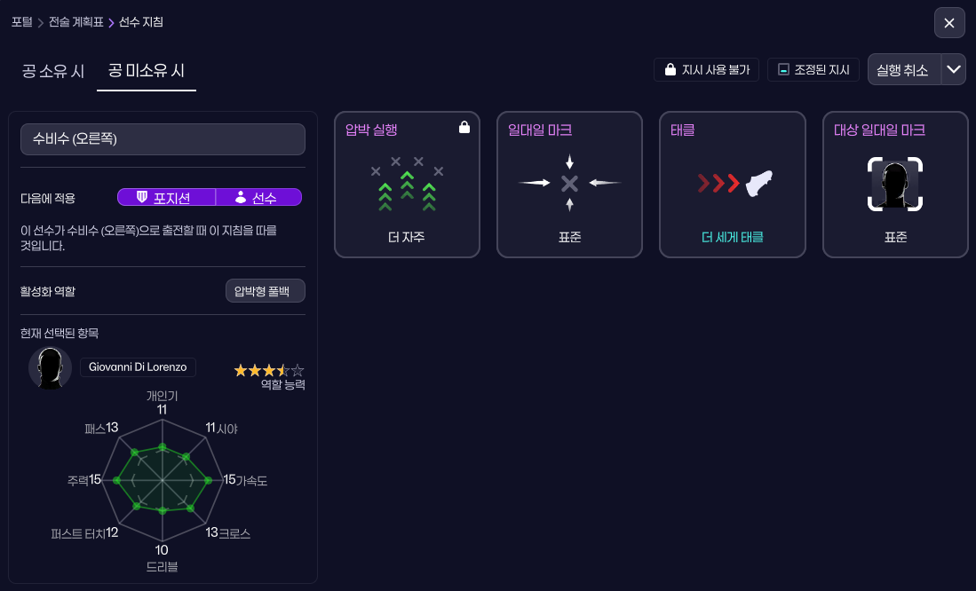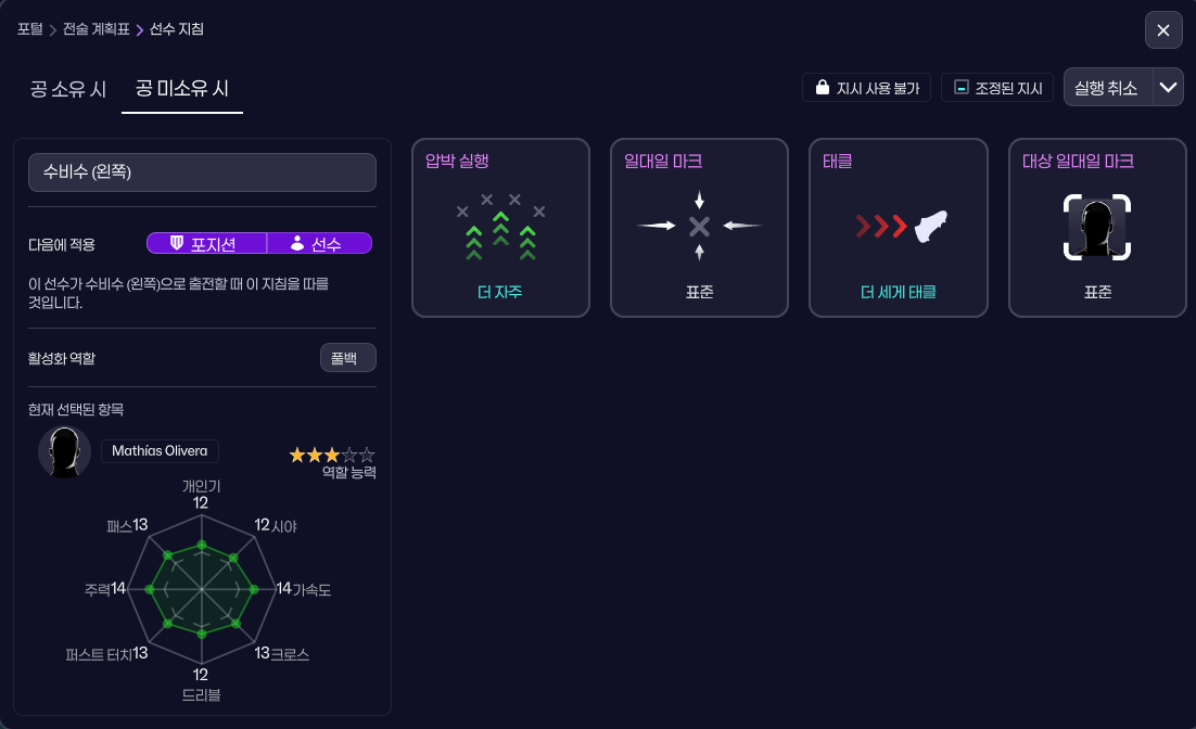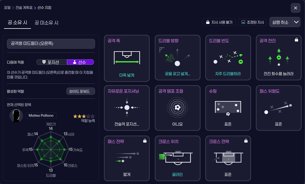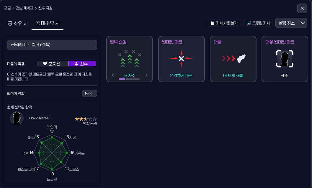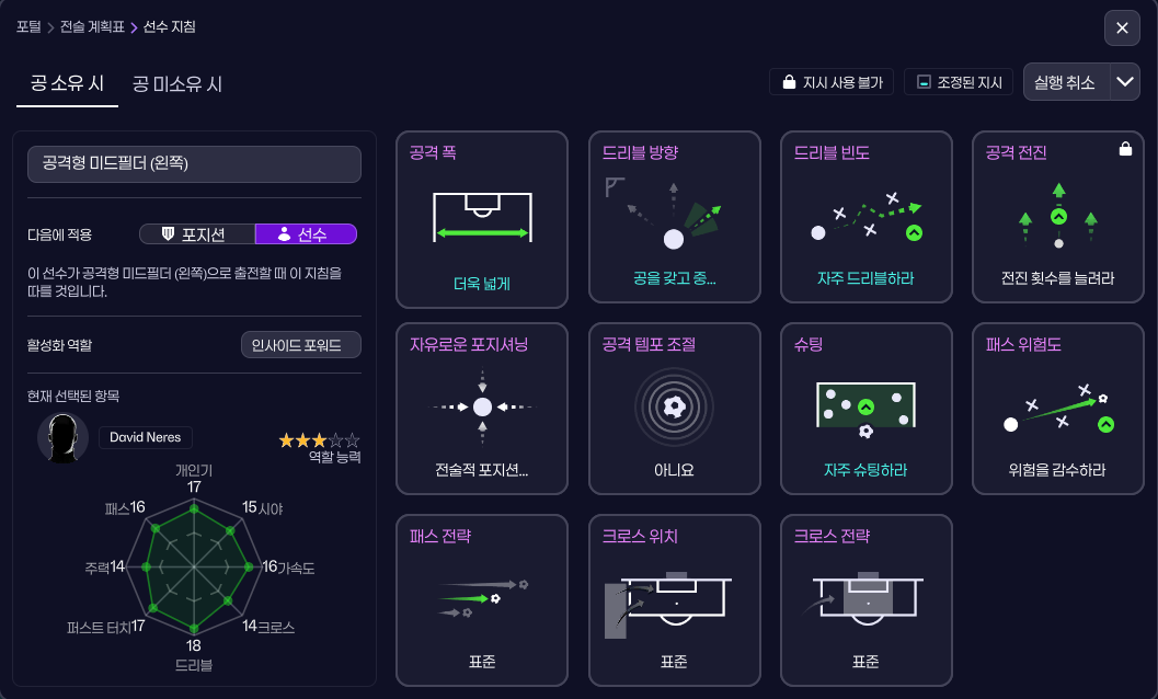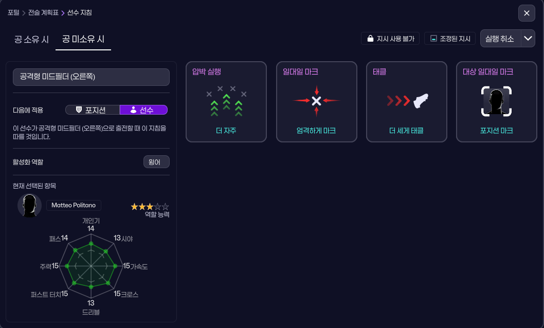 기복적인 측면을 제외하면 드리블링과 킥이 좋다는 점이 내 마음에 쏙 들었다. 한 쪽 윙이 활동량으로 경기를 휩쓰는 타입이라면 한 쪽 윙은 슈팅까지 가져갈 수 있으면 좋겠다고 생각한지라 바로 선발로 기용. 마찬가지로 드리블을 적극적으로 시도하도록 지침했고, 슈팅이 좋다기에 중앙까지 드리블로 들어와 슈팅까지 노려보도록 지침했다. 슈팅의 결정력과 정확도를 보고, 세부 지침을 수정할지 정할 예정이다.