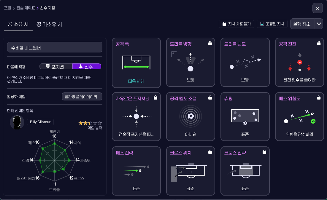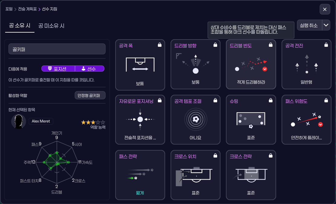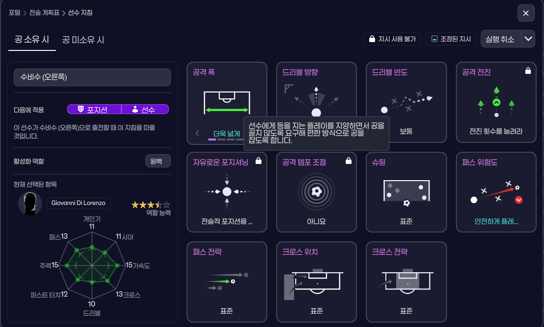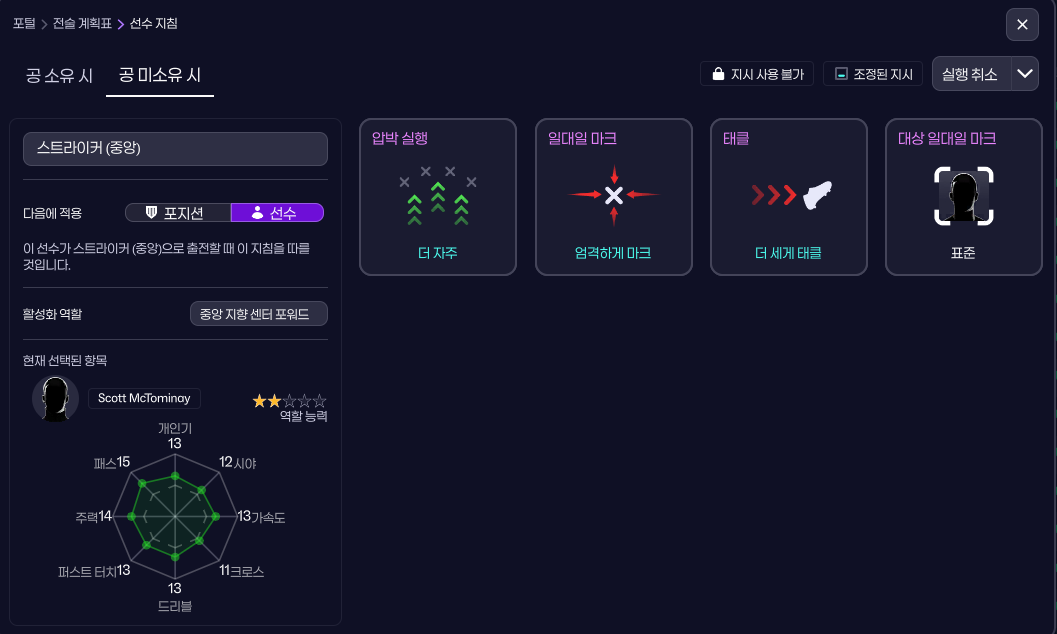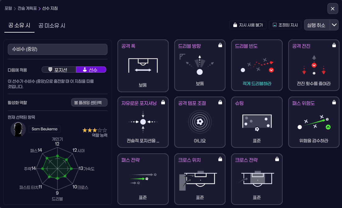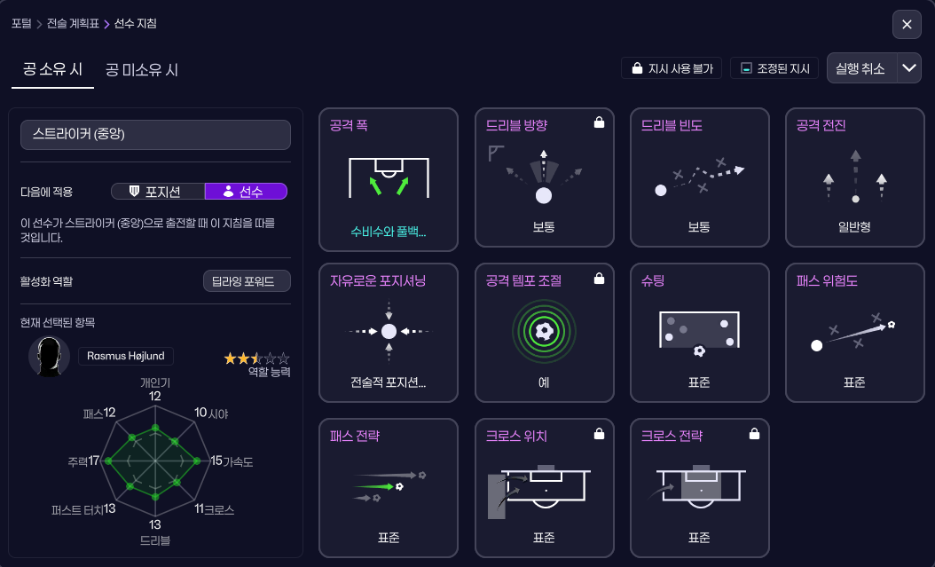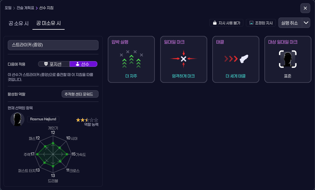 기복적인 측면을 제외하면 드리블링과 킥이 좋다는 점이 내 마음에 쏙 들었다. 한 쪽 윙이 활동량으로 경기를 휩쓰는 타입이라면 한 쪽 윙은 슈팅까지 가져갈 수 있으면 좋겠다고 생각한지라 바로 선발로 기용. 마찬가지로 드리블을 적극적으로 시도하도록 지침했고, 슈팅이 좋다기에 중앙까지 드리블로 들어와 슈팅까지 노려보도록 지침했다. 슈팅의 결정력과 정확도를 보고, 세부 지침을 수정할지 정할 예정이다.