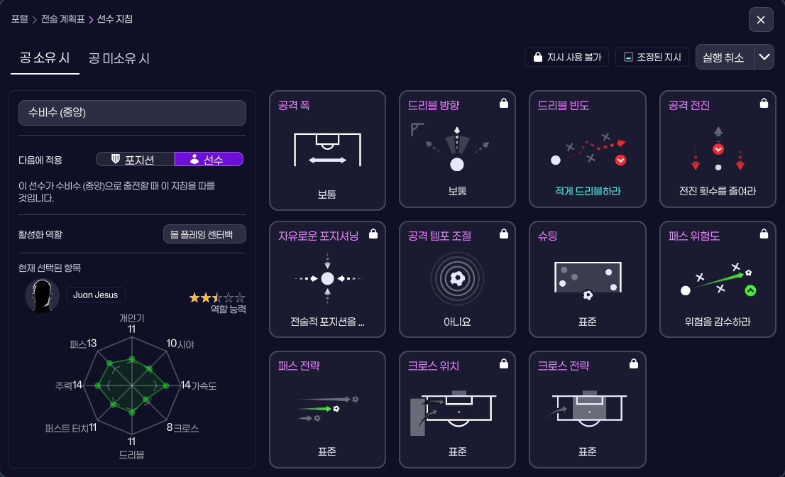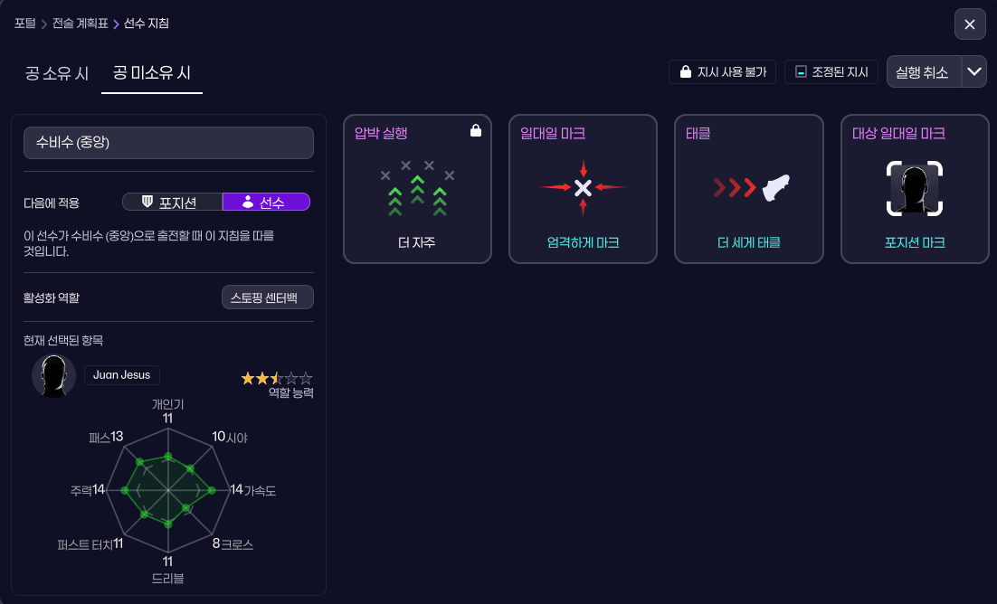내가 센터백 두 명을 짤 때는 기본적으로 두 명의 상성을 고려해서 짜는 편인데, 그래서 보통 한 쪽이 패스나 볼 플레잉에 특화된 센터백이면 다른 한 명은 상대 스트라이커나 침투하는 공미를 잘 마킹하고 수비하도록 수비에 특화된 센터백을 선택하려 했다. 그래서 고른 게 제주스. 상대를 마킹하는 플레이에 집중할 수 있도록 설정했다.