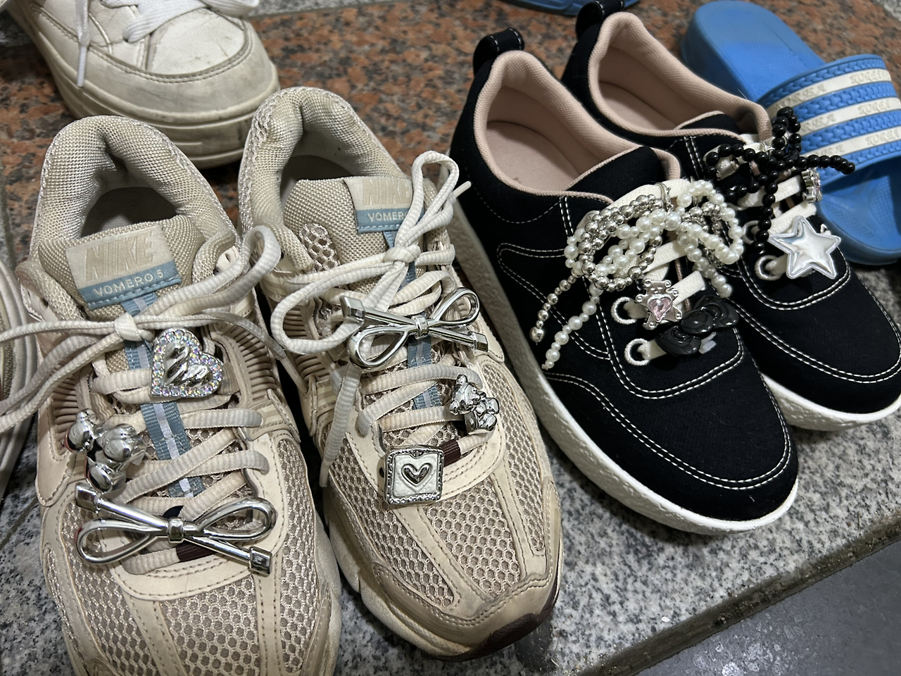무슨 브랜드인지도 모르겠는데, 엄마가 발이 정말 편하다며 모 브랜드의 짝퉁 신발을 하나 사주었다. (분명 엄마가 어디의 카피리고 말해주었는데 기억이 나질 않는다.) 실제로 발이 편했고 디자인도 괜찮았지만 묘하게 촌티가 나기에 요즘 유행한다는 슈즈참으로 신발을 꾸며보았다. “열두 살 같아.” 동생이 참견한다. 나는 원래도 나이에 안 맞는 차림새다. 사과머리를 하거나 고양이 귀 비니를 쓰거나 해열시트를 붙이고 돌아다니거나 하는 식이다. 출근을 할 때도, 대학원 수업을 들을 때도 아랑곳 않고 살았으니 말해 무얼 하나? 그래도 학술제에 가거나 발표를 하거나 인터뷰를 할 때에는 격식을 차린다. 사실 신발을 꾸며놓고 좀 과한가 생각했다. 그런데 웬 걸, 엄마가 신발을 보더니 환호성을 지르며 왜 자기 것은 안 샀냐고 투정이다. 아무래도 슈즈참을 더 구비해야겠다. 엄마의 신발을 다 감당하려면 말이다. 피규어말고도(이전 글 참조) 엄마와 공유하는 의외의 취향이 생겼다.