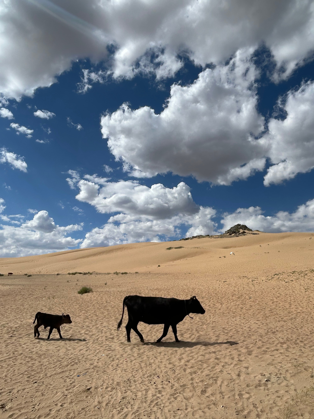 이번 여행의 목적은 자브항이었다. 사막 한가운데의 호수라면 당연히 가봐야지, 미리 찾아본 사진들은 꽤 아름다웠고, 눈에 담은 실재는 초현실주의 화가가 만든 세계 같았다. 그러니까 사막이 있고, 모래 언덕이 곳곳에 자리 잡고, 그 앞에는 바다가 아닐지 의심되는 크기의 호수가 있어서 수영하는 사람들이 많고, 호숫가에는 소들이 여유자적하게 돌아다닌다. 무척이나 강렬한 햇살 아래 이 모든 것이 한 번에 어우러진다. 파란 하늘과 하얀 구름, 모래사장과 듬성듬성한 풀, 여러 마리의 동물까지 전부 르네 마그리트의 그림 그 자체였다. 화가들은 보지 않아도 본인의 눈 안에서 이런 세상을 마주하나 보다. 나는 상상을 이미지로 직조할만한 예술인이 아니라 직접 가보는 수밖에 없었다.