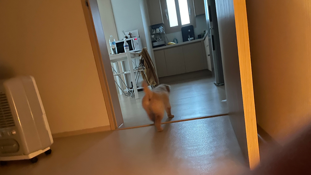 처음 차에서 울던 모습과 다르게 거실을 점차 점령 중인 아기 노을이에요. 처음에는 활동반경이 굉장히 좁았습니다. 너무 멀리 나가는걸 아직은 두려워하는 모습이었어요. 노을 이침대-배변패드-밥그릇 정도만 활동하더니 하루에 1평씩 늘어나는 그런 모습이었습니다. 거실-부엌-옷방-신발장-화장실까지 전부 누비고 다니는데 일주일이라는 시간이 걸렸습니다. 그렇게 노을이는 저의 보금자리에 적응을 하게 되었어요.