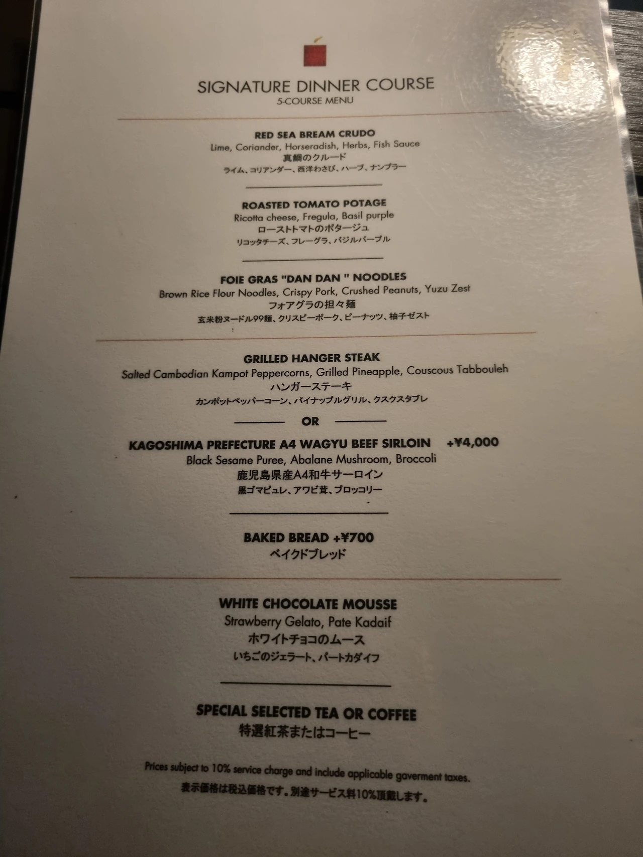 1만 엔 정도 쓸 각오를 하고 있어서 여기 레스토랑의 시그니쳐 메뉴라는 5코스 요리를 시켰다. 동양과 서양의 명품 음식들이 퓨전된 코스라고 한다.